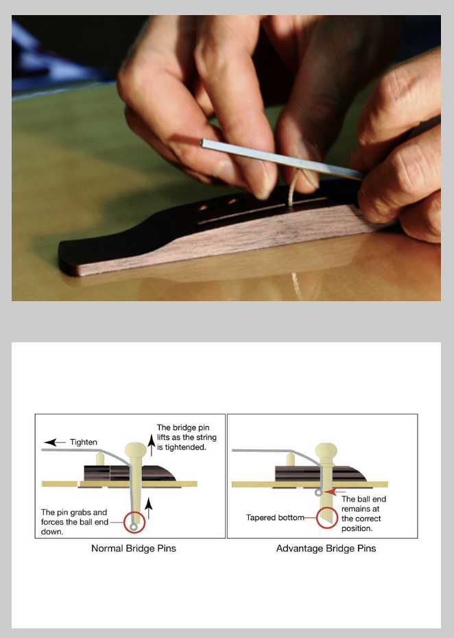 Anche i pin del ponticello testimoniano gli step innovativi di cui beneficiano le nuove chitarre Advanced Acoustic: Ibanez li chiama Advantage e, preposti al fissaggio delle corde e relativa tensionatura, con il loro bulbo ri-disegnato sono più semplici da inserire/disinserire dei pin tradizionali.