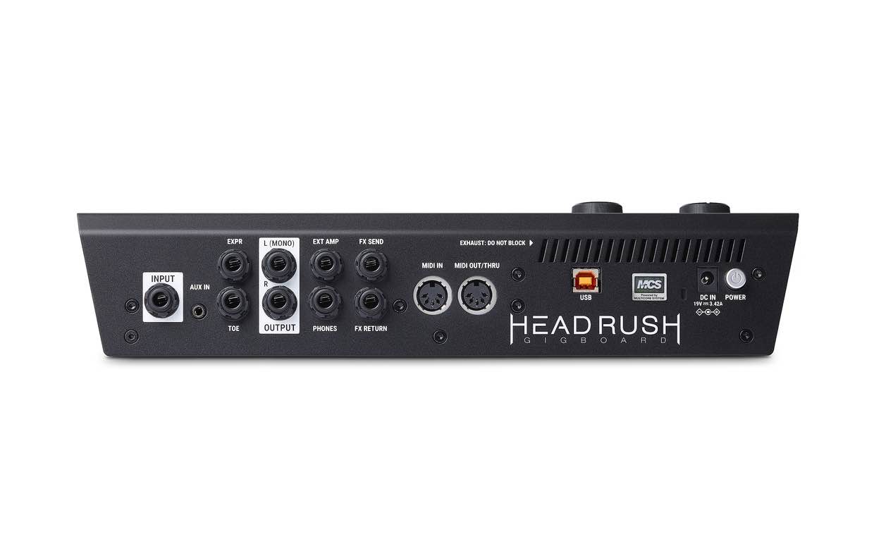A confermare l’enorme versatilità della piccola Gigboard, è il suo pannello posteriore, ricchissimo di connettori che consentono di operare qualsiasi tipo di setup per qualsiasi tipo di esigenza. Un jack standard per il collegamento della chitarra (Input) con accanto un mini-jack stereo per la connessione di sorgenti audio ausiliarie (Aux In), due connettori per la gestione di un pedale di espressione (Expr/Toe), due jack per la connessione agli ampli o all’ingresso di una interfaccia audio (Stereo o Mono Output) ed un jack per gestire in remoto le funzioni di switching del proprio amplificatore (riverbero on/off, channel switching o qualsiasi altro tipo di funzione short-to-sleeve). Quindi, l’uscita per le cuffie (Phones), Send e Return per la connessione di effetti esterni e le immancabili prese Midi (5pin DIN - Midi In, Midi Out/Thru). A ciò si aggiunge una presa USB che, oltre a gestire l’audio da-e-verso una qualsiasi DAW (24bit, fino a 96kHz), garantisce anche il collegamento ad un computer per la condivisione ed il salvataggio dei dati e per l’aggiornamento del firmware. Infine, la presa per l’alimentazione (alimentatore da 19 VDC, 3.42 A, center-positive) e l’interruttore di accensione (Power).