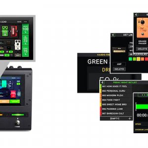 Pur disponendo di soli quattro footswitch, il pannello frontale della Gigboard ripropone il praticissimo touch screen a colori da 7” che rende agile la gestione di tutte le potenzialità del software e che consente di tenere sott’occhio qualsiasi informazione riguardo al Rig in uso e al tipo di programmazione impostato. Sulla sinistra dello screen sono collocate due manopole dalle generose dimensioni: una per la gestione del volume generale di uscita della Gigboard (Master) e l’altra per riuscire a muoversi tra i menu, regolare i valori dei parametri selezionati, nonché per confermare le scelte di programmazione (Push to Enter). Gli switch multifunzione...