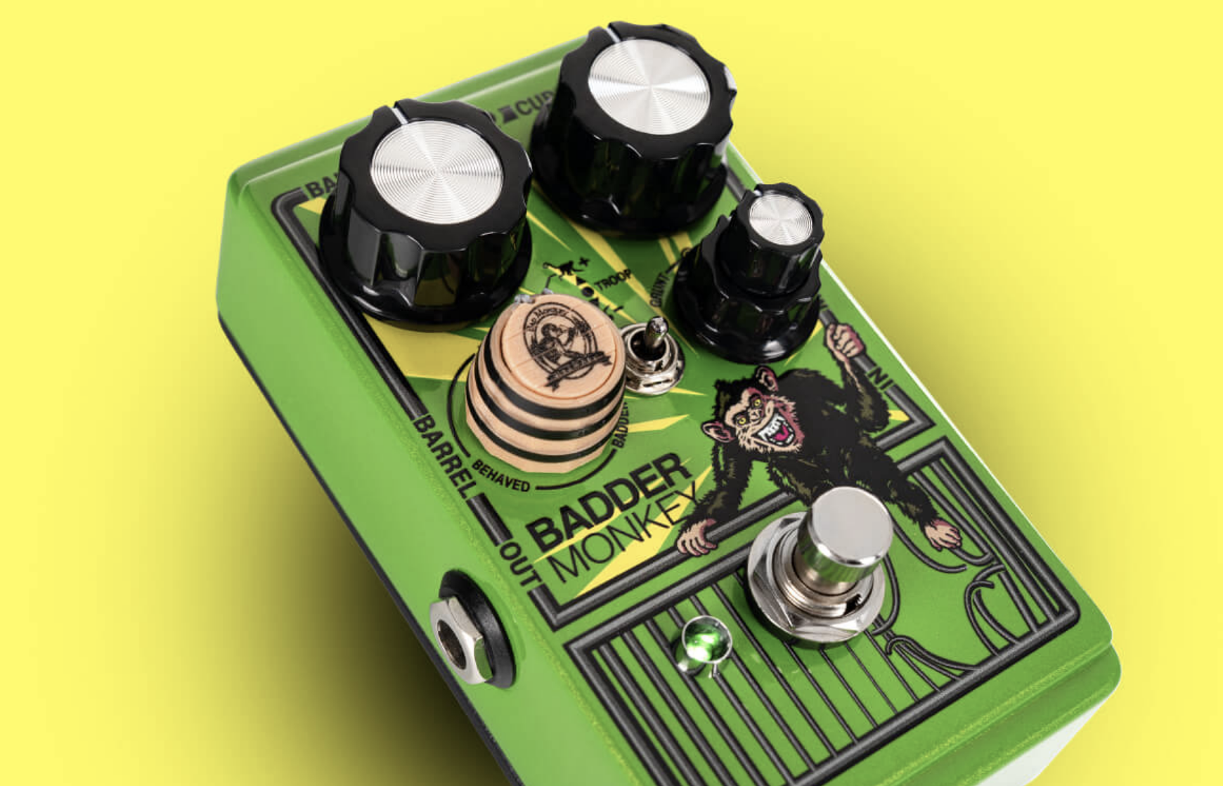 Se il popolare Bad Monkey era l’overdrive della “scimmia cattiva” di casa DOD, ecco che con il Badder Monkey la scimmia diventa ancora più cattiva: tre circuiti overdrive animano infatti il nuovo pedale – Behaved, Bad, Badder – selezionabili tramite il controllo Barrel (brevetto del brand), utilizzabili separatamente o combinabili in parallelo o in controfase (modalità Troop), per centinaia di texture con cui plasmare ad hoc il suono della chitarra collegata. In poche parole, tre overdrive indipendenti in un solo pedale.