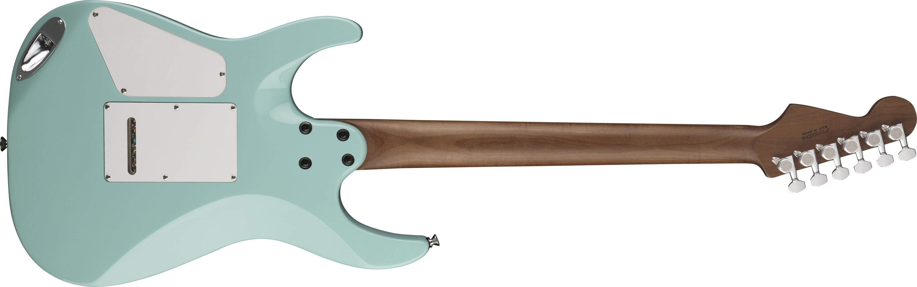 Body: Basswood – Finitura: Celeste – Manico e tastiera: Caramelized Maple – Trussrod: regolabile – Compound radius: 12”-16” – Scala: 25,5” (mm 648) – Tasti: 24, Jumbo Stainless Steel – Segnatasti: dot-Creme – Segnatasti superiori: Luminlay – Capotasto: GraphTech Tusq (mm 42,86) – Meccaniche: Gotoh Locking – Ponte: Gotoh Custom 510 Tremolo – Pickup: Custom Rick Graham Bare Kuckle humbucker/single/single – Controlli: Volume, Tone – Hardware: Chrome – Corde: Nickel Plated Steel (009/042) – Custodia: Charvel Style P/N – Prezzo di listino: Euro 2.799,00