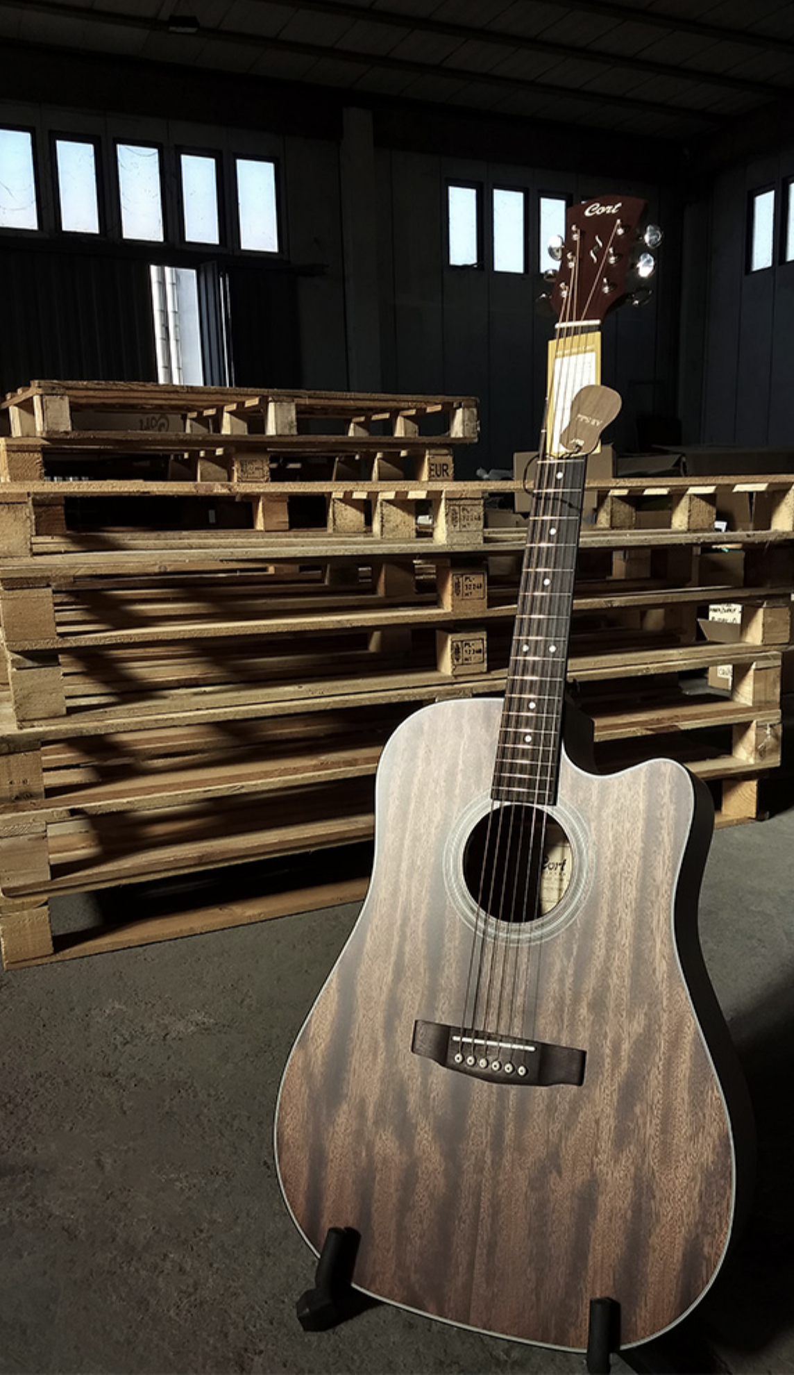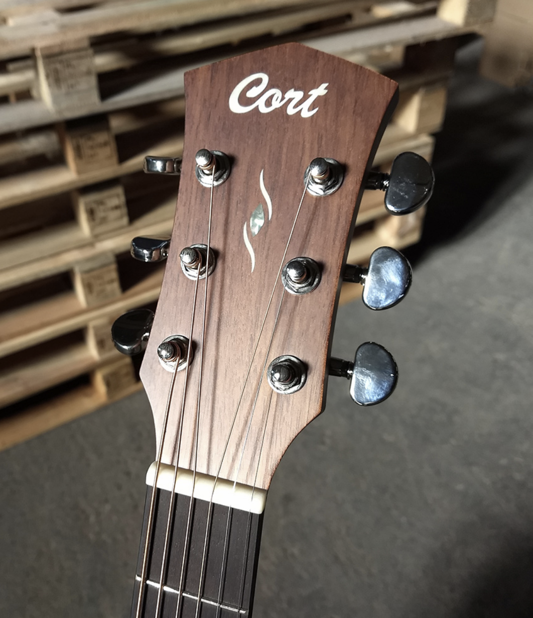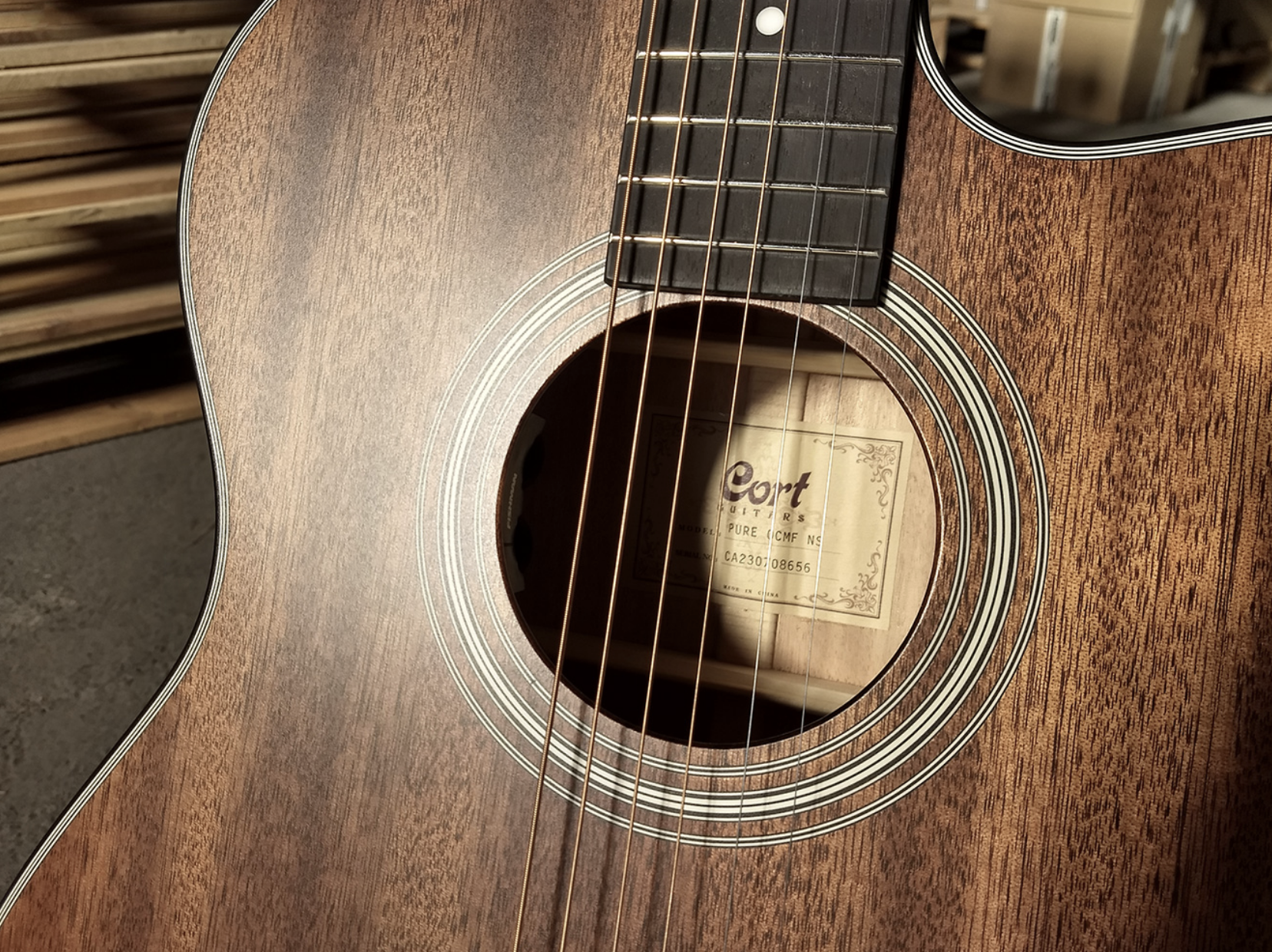 Cort sceglie il mogano massello per il top, il fondo e le fasce delle chitarre Pure, il pregiato legno che, come si sa, genera un suono morbido dal sustain enfatizzato, e vi abbina un manico, sempre in mogano, con tastiera in Ovangkol, parente stretto del palissandro indiano, capace di generare basse e alte ad ampio spettro e medie corpose e brillanti. Anche il ponticello è in Ovangkol ed è dotato di sellette in osso; capotasto di nuovo in osso, con dimensione...
