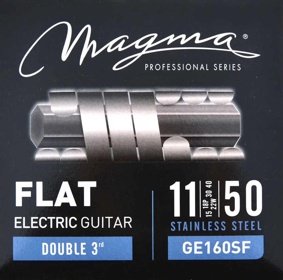 Sono tre le mute che la Magma Flat Series propone al chitarrista elettrico: (GE140SF)010-046. (GE160SF) 011-050. (GE170SF) 012-052. Le mute GE140SF e GE160SF contengono una terza corda aggiuntiva. Ciascun packaging è riciclabile.