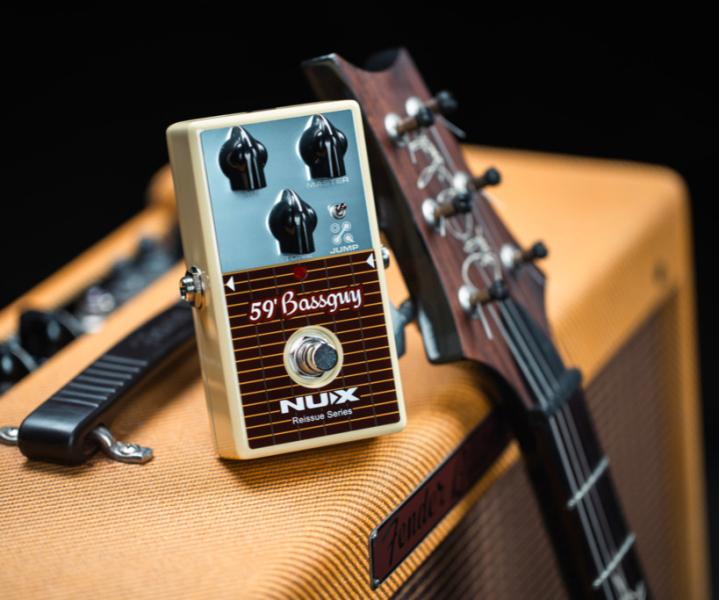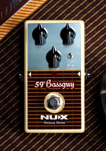 La grafica dello chassis, così come i potenziometri a becco d’oca, rivelano visivamente lo spirito vintage del Nux ’59 Bassguy, mentre all’interno si cela un circuito analogico/true-bypass, progettato per replicare la tipica pasta sonora del Fender Bassman Amp e fornire al segnale solidità ed efficienza. Tre potenziometri sul pannello – Gain, Master, Tone – per le rispettive regolazioni, più lo switch Jump, la cui attivazione si prefigge di replicare il suono Bright del famoso amplificatore; un vero e proprio plus del pedale.