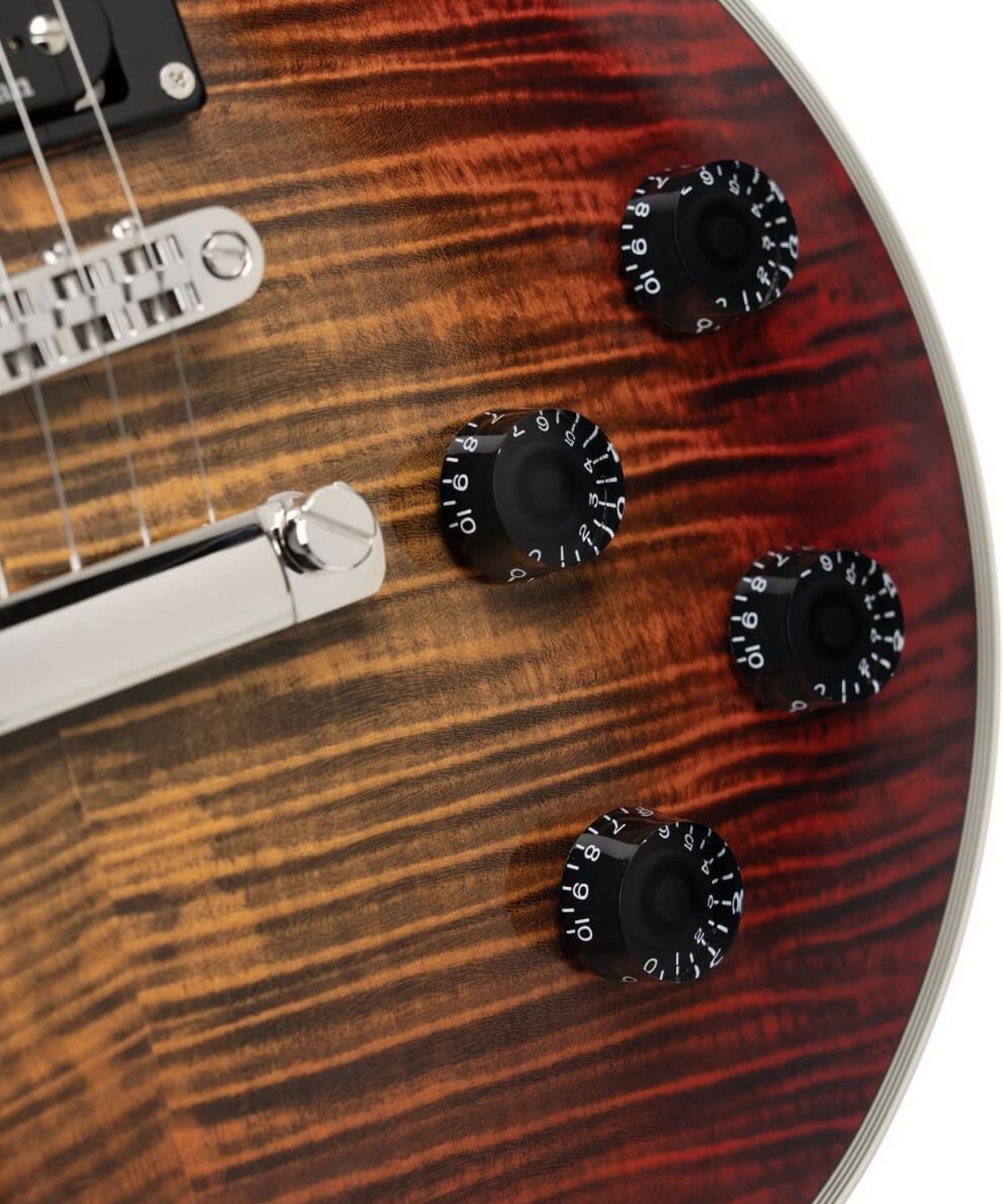 Per finire, la pregiata fiammatura dell’acero del top con finitura Flaming Burst, da cui la sigla FB assegnata alla chitarra, e...