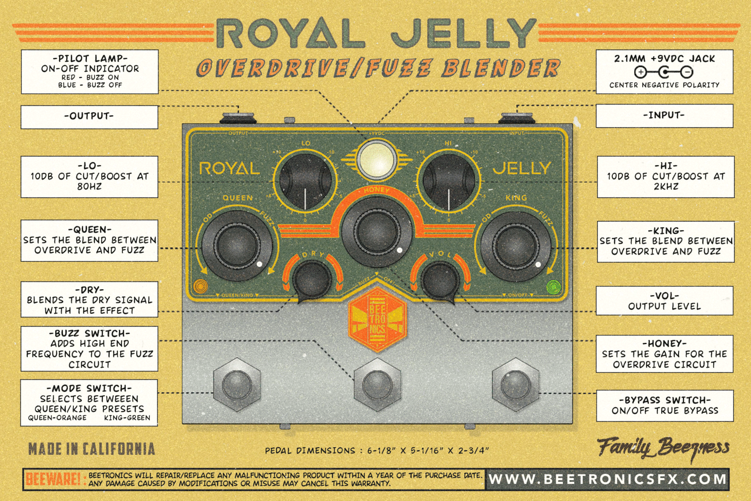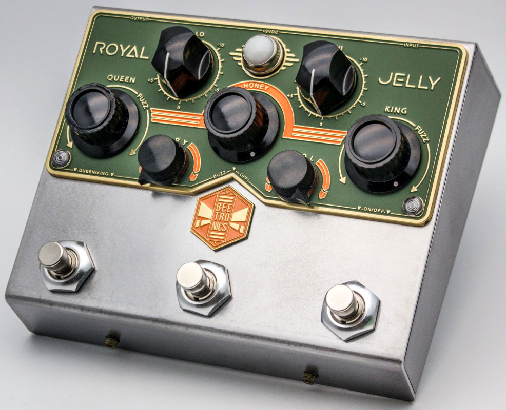 ritmiche gigantesche saturate con l’overdrive. Esaltando gli acuti e tagliando i bassi, si ottiene infine tutta la gamma di suoni possibili mescolando overdrive e fuzz, sino a giungere ai suoni più lancinanti e taglienti con Queen e King regolati alla massima saturazione possibile. Ma c’è di più. Royal Jelly dispone dell’effetto Buzz in grado di esaltare il fuzz ancora di più, rendendolo vetroso sugli acuti (… come accadeva con i pedali fuzz degli anni Settanta). Qualcuno potrebbe scambiarlo per un pedale limitato alla saturazione, mentre in realtà è molto versatile, ed in grado di rispondere a dovere al tocco del plettro sulle corde, proprio come se lo sentisse...