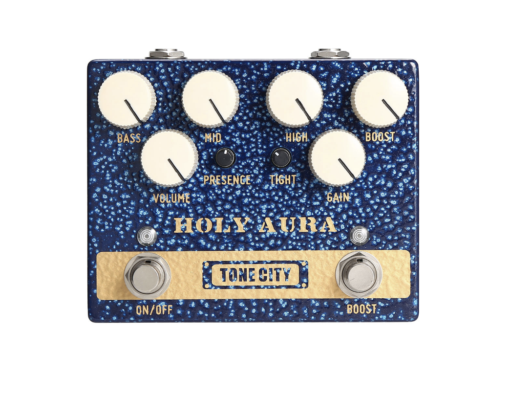 Holy Aura (Distorsore/Boost) – Si ispira al cosiddetto HiGain degli amplificatori valvolari a stelle e strisce, con il gain regolato sulle medie ed il boost in prima linea, per un suono carico di presenza e definizione. Una nutrita suite di controlli (Bass, Mid, High, Boost, Volume, Gain) regolabili in maniera indipendente e in aggiunta due mini-potenziometri rotativi a regolare Presenza e Tight (quest’ultimo per la regolazione chirurgica delle distorsioni; dalle più classiche e ruvide alle più moderne e super-definite). Due gli switch a pedale: On/Off e Boost. Finitura chassis: blu con superficie ruvida. Prezzo: Euro 145,00