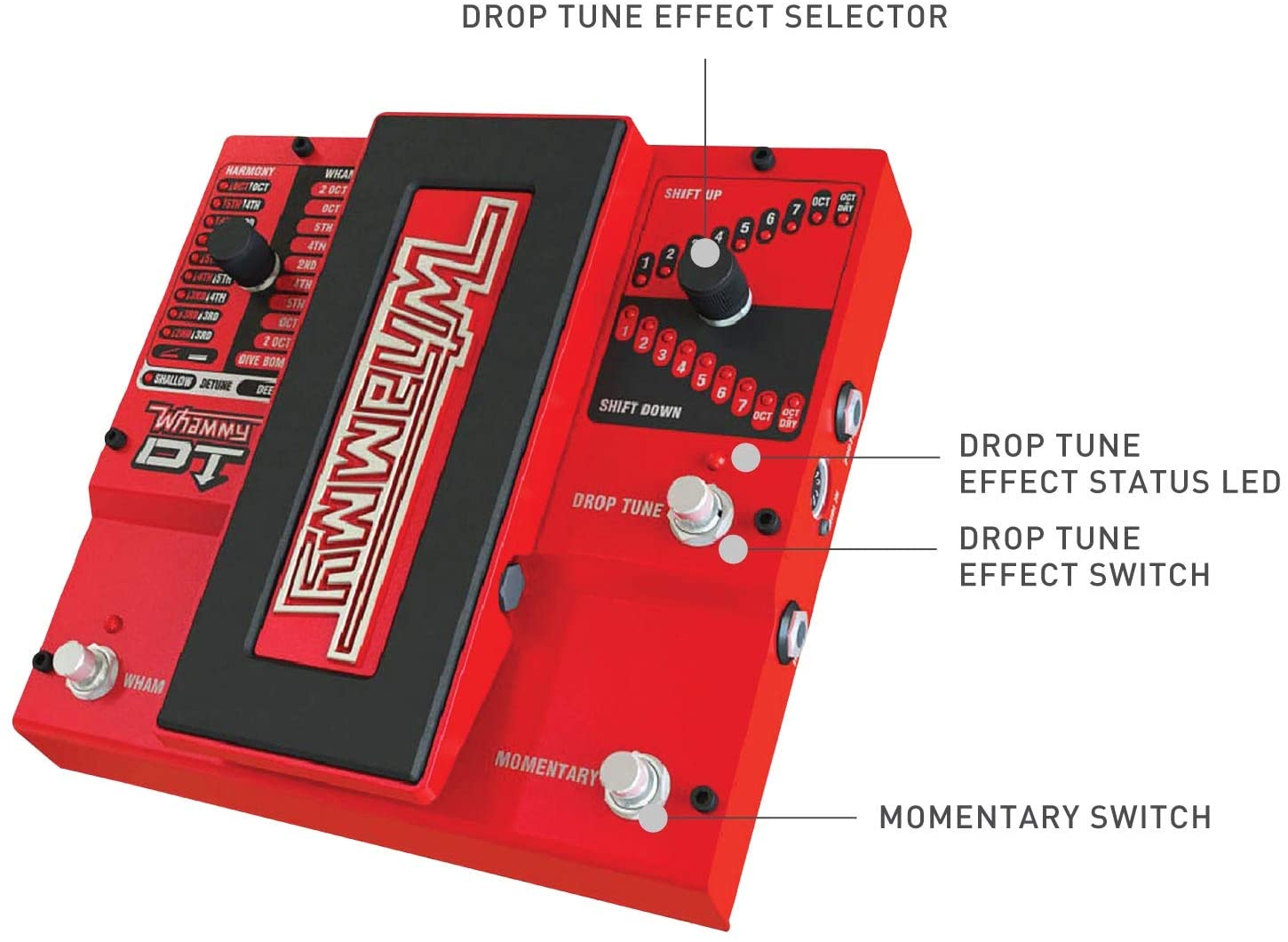 Mantenendo ben salde le specificità del leggendario Whammy Pedal ed i suoi più variegati effetti di pitch shiftin, il nuovo Whammy DT aggiunge la funzione di Drop Tuning tramite cui poter abbassare/alzare l’accordatura di 7 semitoni, oppure di un’ottava, in tempo reale, senza agire sulle meccaniche della chitarra, ma semplicemente tramite l’apposito footswitch. Una funzionalità decisamente utile soprattutto sul palco, che permette di suonare qualsiasi brano in scaletta senza dover cambiare l'accordatura sullo strumento.