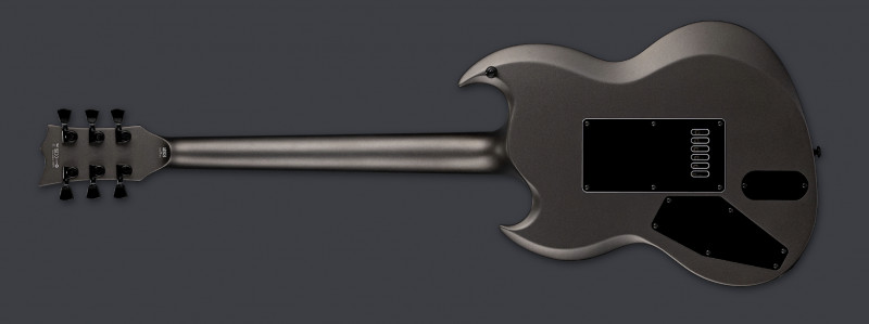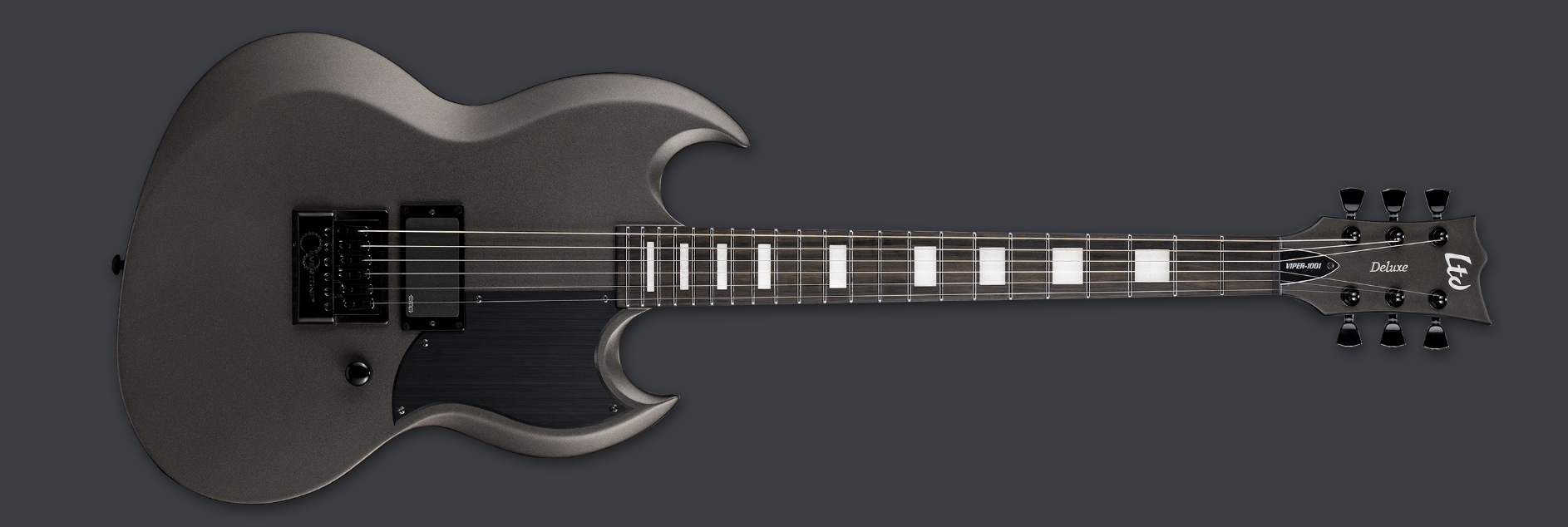 La LTD Deluxe Viper-1001 Evertune si propone nella finitura Charcoal Metallic Satin, ripresa anche dalla paletta, e di hardware nero.