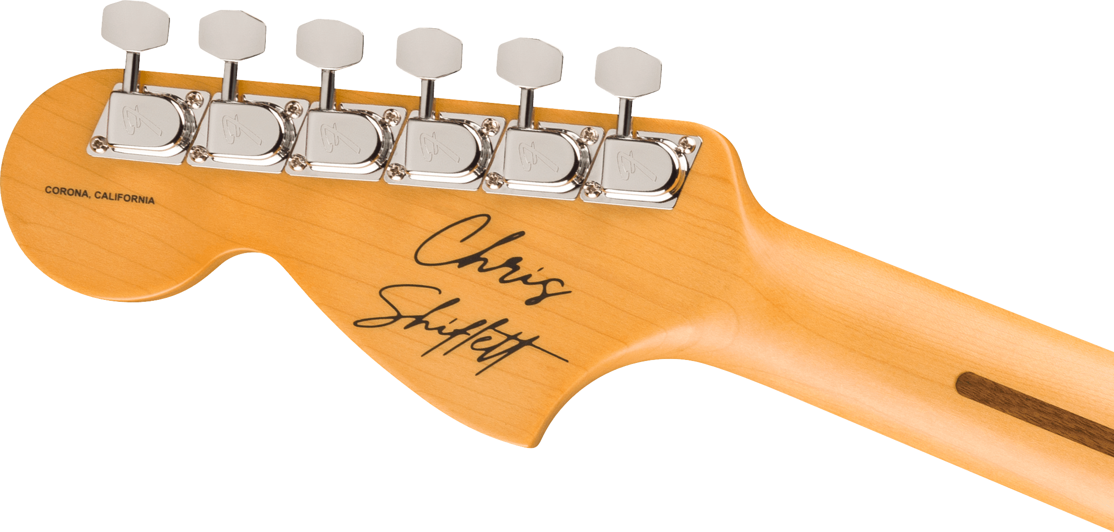 Manico in acero, con profilo Oval-C pensato per le esecuzioni più veloci, scala di 25,5” e tastiera in palissandro di tipo Slab, con curvatura di 12” e 21 tasti Medium Jumbo. Capotasto in osso. Trovano posto sulla paletta sei meccaniche F-style, più l’apposito spaziatore delle corde per la salvaguardia dell’intonazione delle corde nelle performance più lunghe e aggressive. Ponte Pure Vintage string-thru-body con sei sellette in acciaio per la massima enfasi di risonanza e sustain.