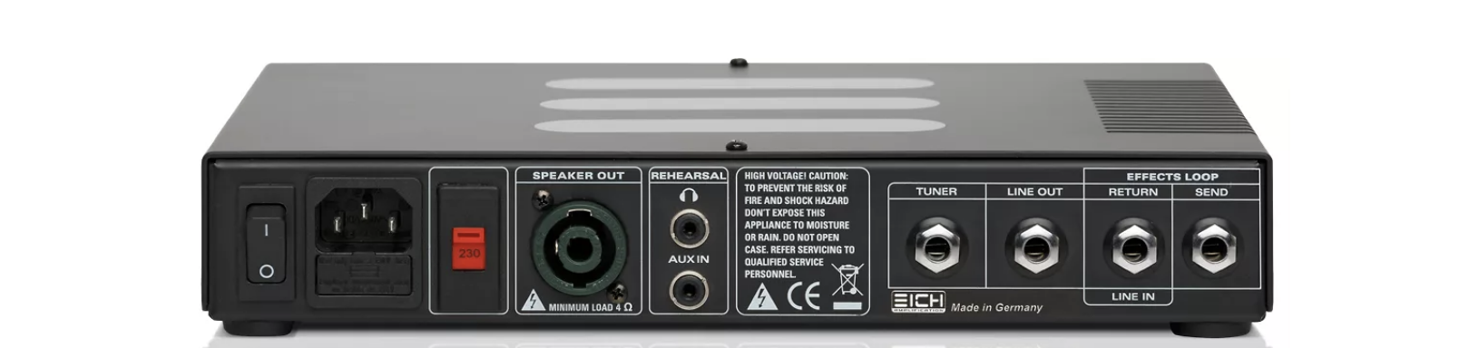 Sul pannello posteriore della T300 trovano posto l’interruttore di accensione, la presa di alimentazione ed il commutatore di tensione 115/230V (50/60 Hz). Segue l’uscita Speaker Out per il collegamento al cabinet esterno, quindi la presa Red Aux-In per la connessione a dispositivi mobili (smartphone, tablet, computer) per jammare sui propri brani preferiti ascoltandosi in cuffia (presa Rehearsal) e senza necessitare del cabinet. (Il catalogo Eich ne propone diverse opzioni).