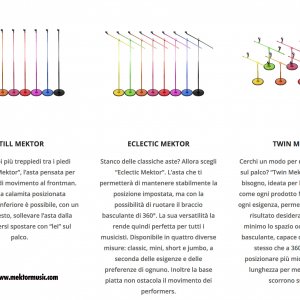 Twin Mektor – Questo tipo di asta nata per l’amplificatore ma adattabile ad altra esigenza (bass drum inclusa) richiede un ingombro minimo, così che ben si addice al palco, alla sala prove ed ogni altro habitat, di dimensioni contenute. Il braccio basculante è in grado di ruotare su sé stesso ma anche a 360° e consente peraltro il posizionamento di più microfoni su tutta la...