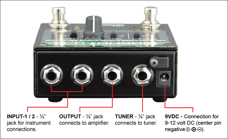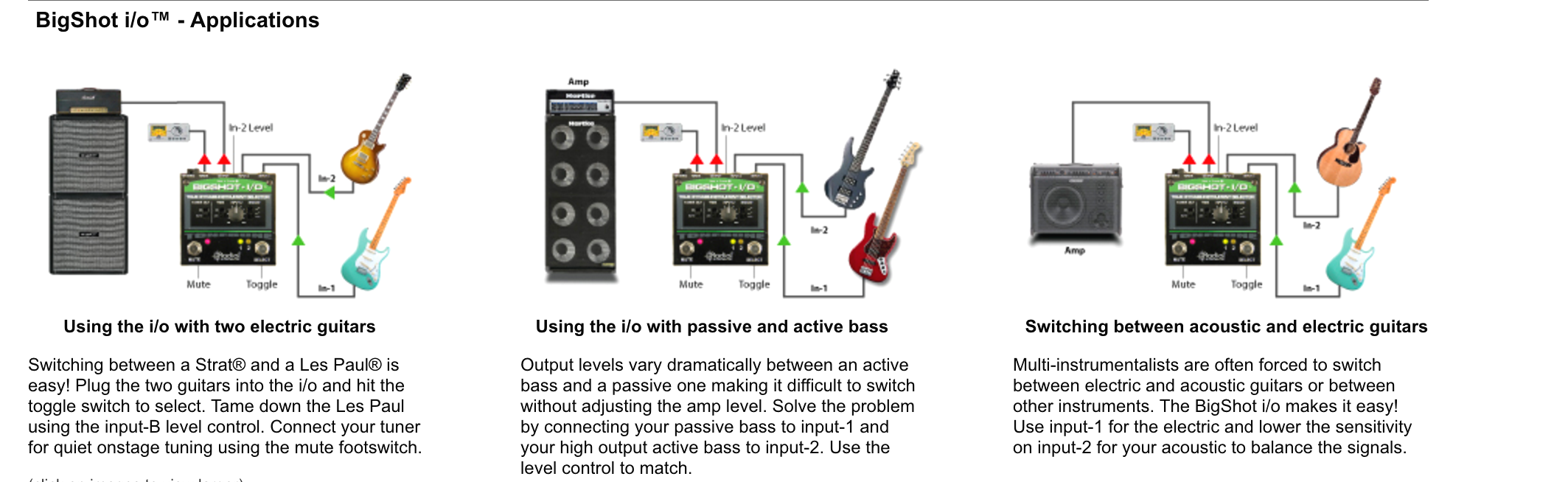 Il nuovo BigShot I/O è dotato di apposita uscita per l’accordatore: con la semplice selezione dello switch col piede, il suono inviato all’ampli va in Mute e consente al musicista di accordare il suo strumento sul palco in tutta tranquillità.
