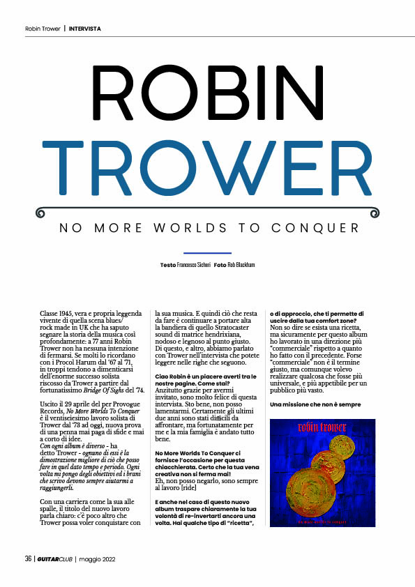 Dopo Lifeson, anche Andy Timmons e Robin Trower tornano tra le nostre pagine con due nuovi album e due interviste intrise di saggezza e perizia chitarristica. Electric Truth è il titolo del nuovo album di Timmons e No More Worlds To Conquer il titolo di quello firmato Trower, due lavori che sanno trasmettere un senso di continua riscoperta portata avanti da musicisti divisi da "generazioni anagrafiche" ma uniti dallo stesso, profondo, amore per ciò che mettersi in gioco sa regalare.