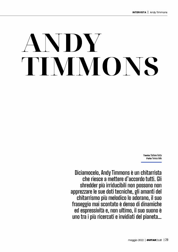 Diciamocelo scrive Stefano Xotta, autore dell'intervista Andy Timmons è un chitarrista che riesce a mettere d’accordo tutti. Gli shredder più irriducibili non possono non apprezzare le sue doti tecniche, gli amanti del chitarrismo più melodico lo adorano, il suo fraseggio mai scontato è denso di dinamiche ed espressività e, non ultimo, il suo suono è uno tra i più ricercati e invidiati del pianeta…