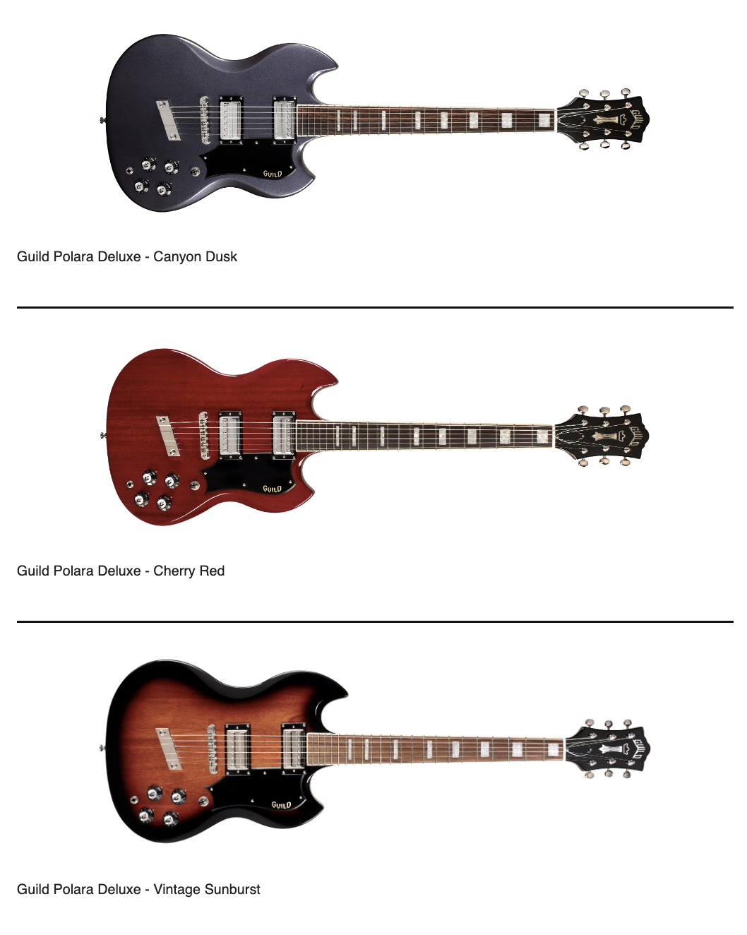 Polara Deluxe – Scala: 24 ¾” (mm 629) – Body: Mahogany – Trussrod: Dual Action – Manico: Mahogany (Vintage Soft-U) – Tastiera: Indian Rosewood, radius mm 320 – Tasti: 22 Narrow Jumbo – Segnatasti a-blocco, Pearloid – Capotasto: Composite, mm 43 – Meccaniche: Guild Vintage 18, open gear – Battipenna: Black – Ponte: Tune-o-Matic – Tailpiece: Guild Stopbar – Humbucker: Guild HB2+ (ponte e manico) – Controlli: Volume e Tone per ciascun humbucker, selettore a 3 posizioni con push/pull per lo split del coil – Corde: D’Addario EXL110 (010-046) – Finiture: Canyon Dusk, Cherry Red e Vintage Sunburst – Listino: USD 699,00