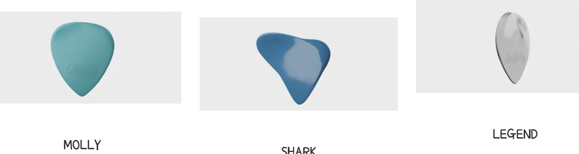 16 modelli, a goccia, a lama, a cuore; in acetato, copoliestere, celluloide, ABS e quant’altro; con grip differenti; con gli spessori più diversi grazie allo stampaggio ad iniezione, il catalogo PlickThePick propone una palette di plettri decisamente vasta e variegata.