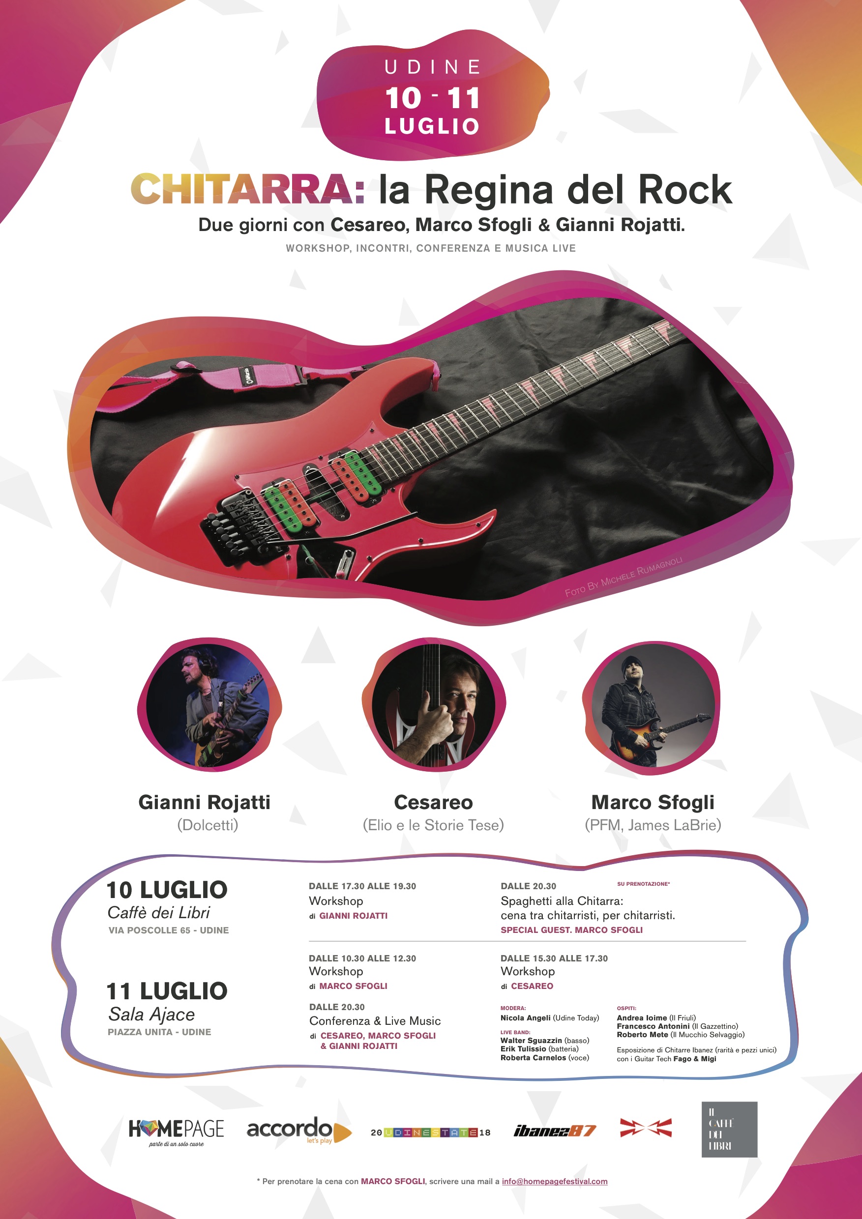 Martedì 10 e mercoledì 11 luglio 2018 a Udine due giorni di lezioni, conferenze e live con tre fra i più apprezzati chitarristi rock italiani: Cesareo, Marco Sfogli e Gianni Rojatti.