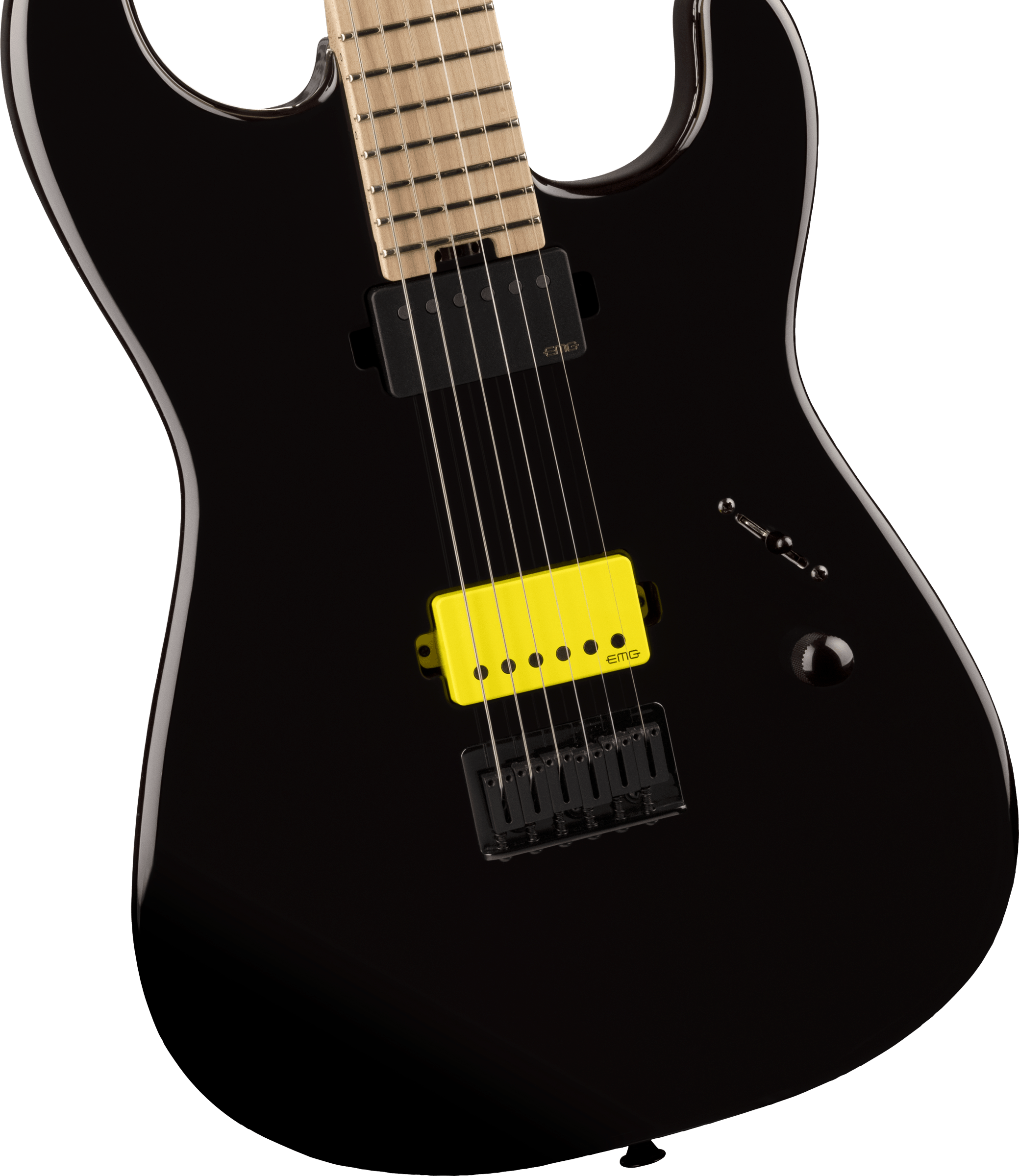 Costruzione bolt-on e body San Dimas design in ontano, la neonata seicorde è dotata di un manico speed con finitura posteriore satinata e tastiera dai bordi arrotondati, ad agevolare comfort e velocità di esecuzione. Due gli humbucker (HH) di bordo: più precisamente, un EMG 57 al ponte (con mascherina gialla) ad evocare le inconfondibili peculiarità di un PAF, ricco di headroom, punch e presenza, ed un EMG 66 al manico (con mascherina nera) per la rotondità delle medie e la massima articolazione delle note nei registri più alti. Selettore a tre posizioni ed un controllo del Volume.