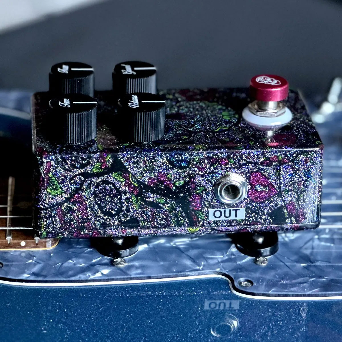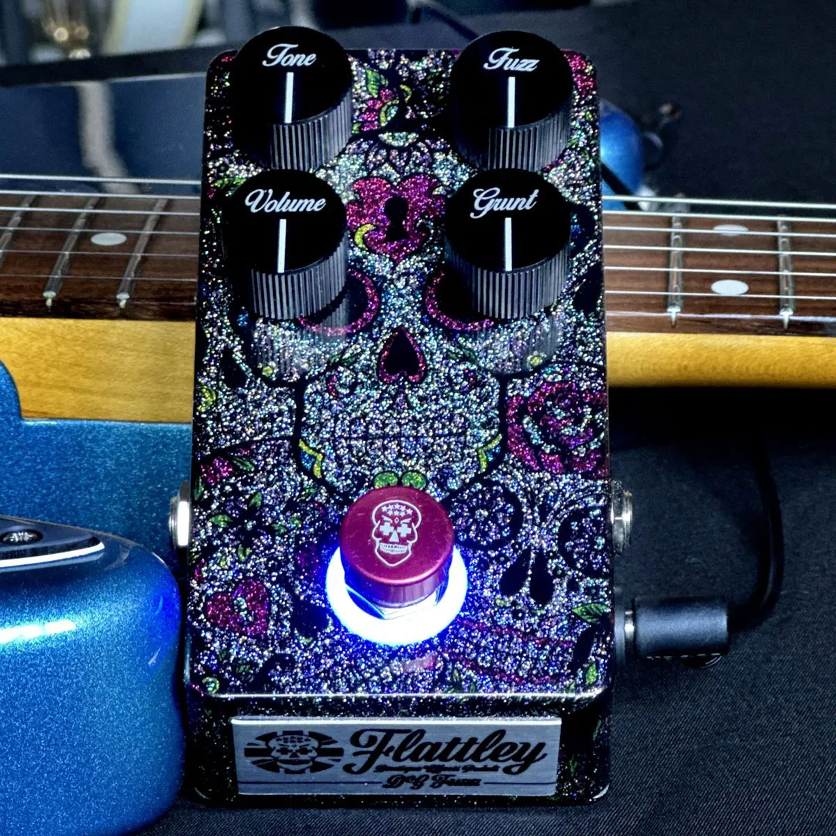 Il DG Fuzz è parte della serie Platinum di Flattley, e pertanto gode di quel trattamento estetico incredibilmente dettagliato, e realizzato a mano, per il quale Flattley si sta facendo conoscere un po’ in ogni dove. Nel caso del DG Fuzz l’occhio ricade obbligatoriamente sul teschio calavera che fa da logo al brand, e che sul pedale si ritrova in una veste brillantinata e luccicante. Il DG Fuzz è completato, così come gli altri pedali del brand, da un led di attivazione posizionato in concomitanza del footswitch sotto forma di anello luminoso.