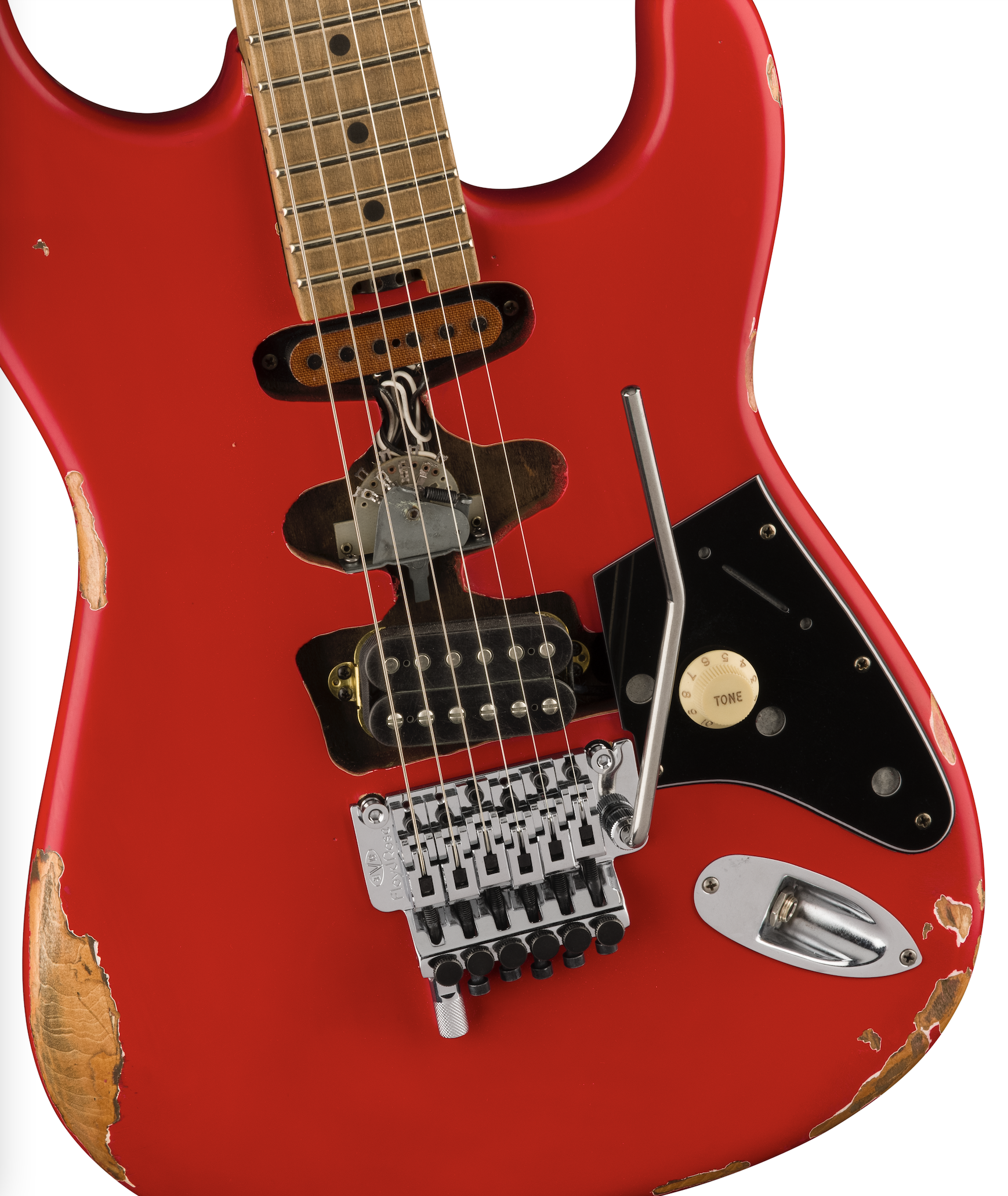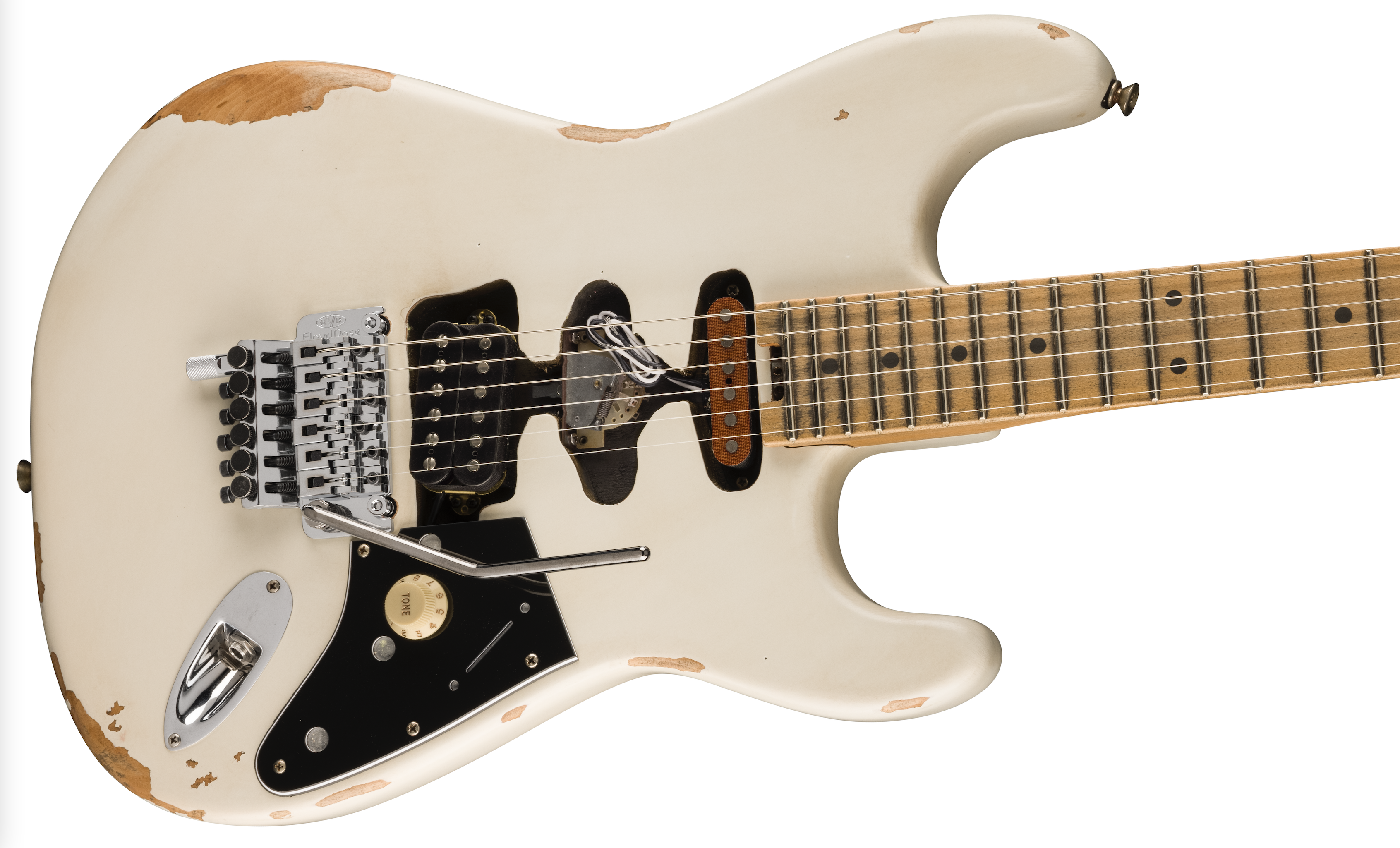 Body in tiglio (pezzo unico), manico in acero (C modified), trussrod regolabile e tastiera in acero con radius compound 12”-16” per il playing più veloce, la nuova EVH Frankenstein Relic, privata delle iconiche strisce del passato, ripercorre lo spirito della leggendaria chitarra di Eddie, naturalmente, usura inclusa: humbucker al ponte inserito direttamente nel body (con magneti Alnico 2) e cavità a-vista nella posizione centrale per l’alloggio del circuito, oltre a un “dummy” pickup con bobina fenolica rossa (non attivato nella chitarra di Eddie delle origini).