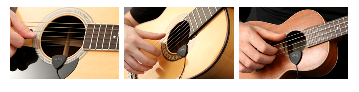 iRig si installa in pochi secondi, agganciando la clip sulla buca della chitarra acustica (o dell'ukulele). La si disinstalla in altrettanti pochi secondi ed è comodamente riponibile in tasca nella sua piccola custodia.