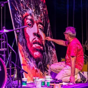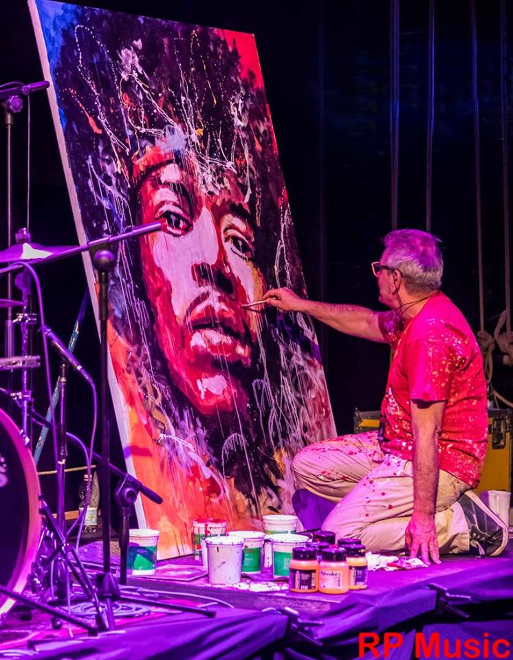 La band interpreta magistralmente l’intramontabile repertorio di The Jimi Hendrix Experience, illustrato dalle scenografie e dalle tele del noto pittore Franco Ori, che durante lo show dipingerà un imponente ritratto di Jimi.