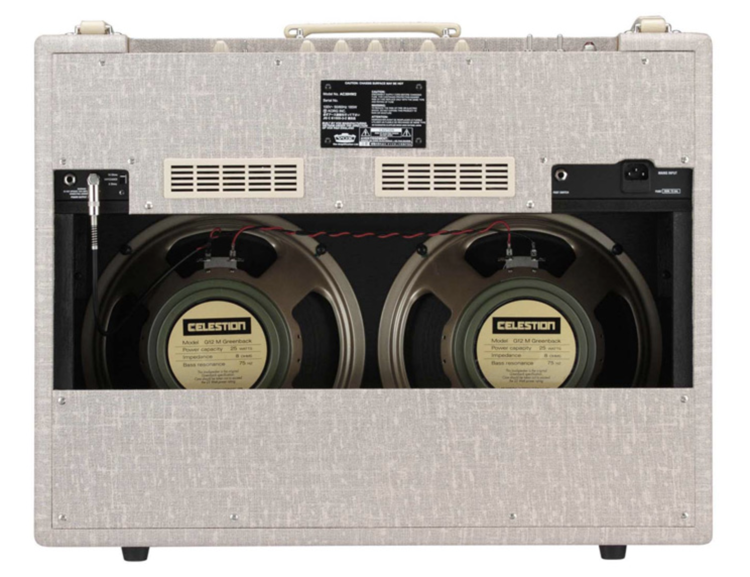 30W RMS (8/16 ohms) e due speaker Celestion da 12” (G12M Greenback oppure Alnico Blue) – Preamp valvolare (3x ECC83 e 12AX7) – Power amp valvolare (4x EL84) – Rectifier (1x GZ34) – Controlli: Master Volume, Master Tone Cut, Normal Volume, Top Boost Volume, Top Boost Bass e Top Boost Treble – Ingressi: Normal High, Normal Low, Top Boost High, Top Boost Low, Footswitch – Uscite: 2x Speaker esterni.