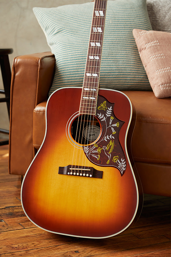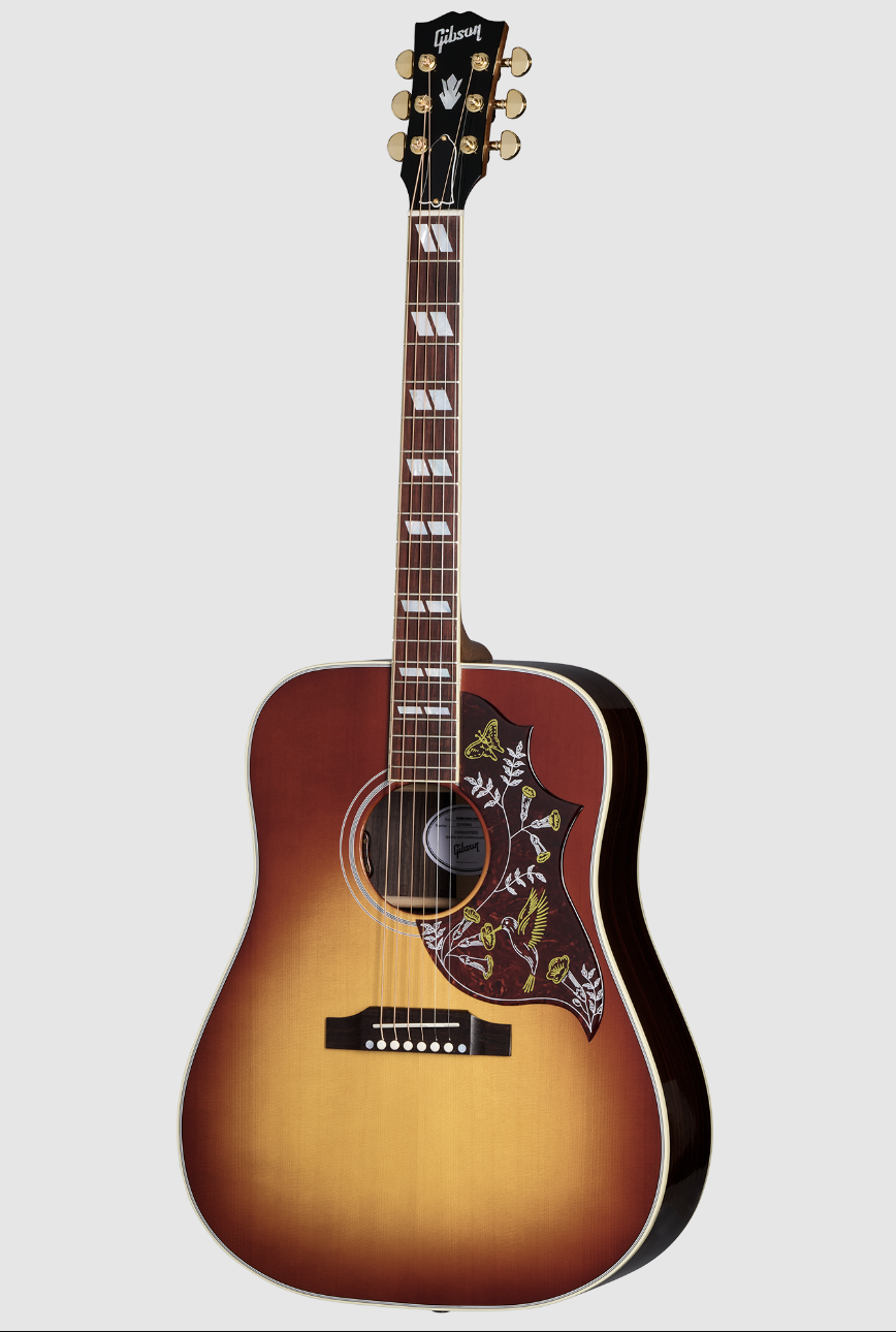 Come il suo nome lascia intendere, la Gibson Hummingbird Standard Rosewood beneficia di un body in Palissandro, le cui tipiche spalle squadrate e arrotondate, ma anche le catenature a X scolpite a mano, concorrono a forgiare l’iconico suono della chitarra: squillante e articolato, con la corposa risposta delle basse e del volume, ed in più, fedelmente restituito dall’elettronica LR Baggs VTC di cui è equipaggiata. Il body è in finitura Gloss Nitrocellulose e si completa con un top in Abete Sitka in finitura Burst con tanto di binding multistrato a definirne il contorno. Sul top, infine, il battipenna tartarugato con la peculiare grafica Hummingbird (colibrì) distingue la seicorde a livello estetico.
