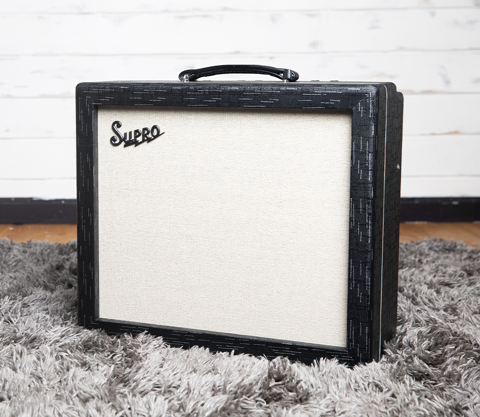 Chassis in pioppo con rivestimento in tolex Black-Scandia, griglia in tessuto e maniglia (Vinyl Dog Bone) per il trasporto, completano la dotazione del performante Supro Royale.