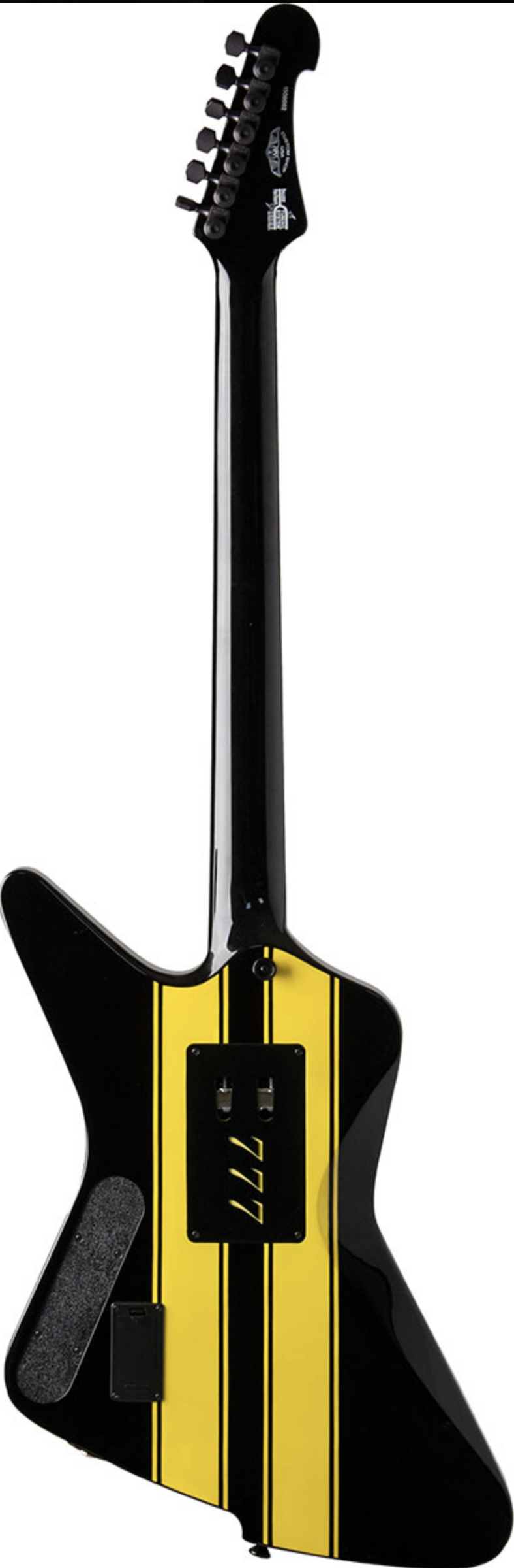 – Body: mogano – Manico: mogano (set neck) – Tastiera: ebano – Tasti: 24 Super Jumbo – Segnatasti: Split Block – Nut: mm 43 Graphtech Tusq – Scala: 25,5” – Pickup: H/H Seymour Duncan USA Blackout – Selettore: 3 vie – Controlli: Volume/2 Tone – Ponte: Original Floyd Rose – Meccaniche: Grover 18:1 – Corde: D’Addario EXL120 Light – Finitura: Black/Yellow – Hardware: Black – Custodia: GCPS2012