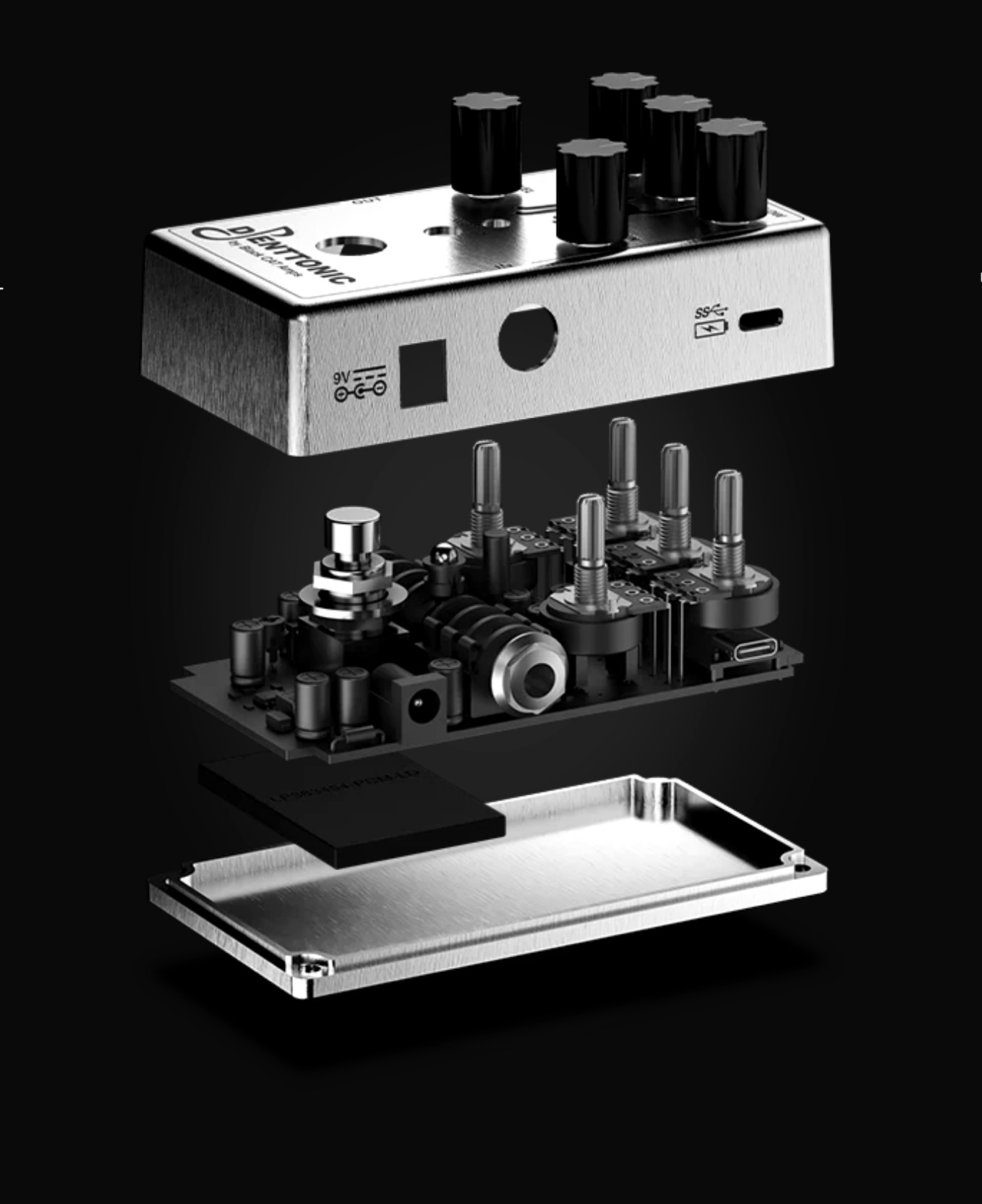 Tutti i componenti del circuito del Djenttonic sono di qualità premium e, all’insegna della vera innovazione, montati su una apposita base e privi di cavi e saldature; tale base è racchiusa nel robusto chassis di metallo, la cui superficie superiore dà alloggio ai cinque potenziometri di bordo. Ma non è tutto in quanto a innovazione ed infatti Djenttonic è il primo pedale ad integrare una batteria al litio per l’alimentazione e una presa USB-C per la ricarica. (Previsto anche l’impiego di un alimentatore standard 9V).