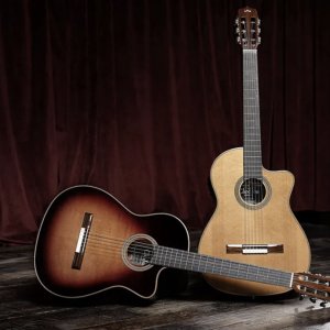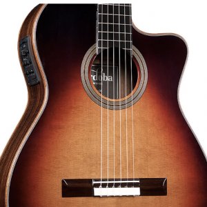 La denominazione della seicorde di casa Cordoba fornisce già gli indizi dei suoi tratti somatici: si tratta infatti di una Orchestra Model, Cutaway, Elettrificata (CE), che il brand inserisce nella serie Fusion, optando per due finiture: Natural e Tear Drop Sunburst.