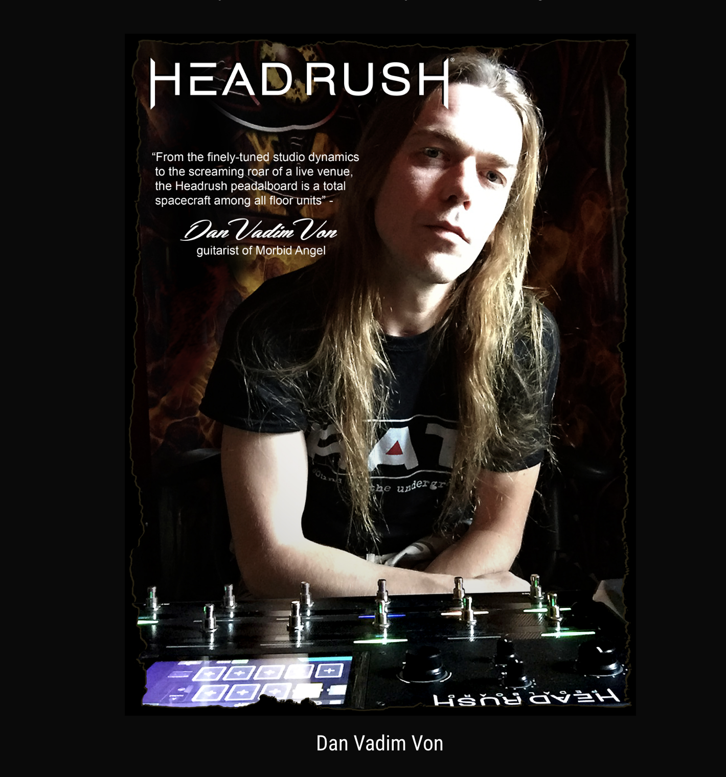 che si tratta di un prodotto tra i più innovativi presenti oggi sul mercato. Questa unità contempla una libreria praticamente infinita di opzioni timbriche, ottime per ogni stile chitarristico. Ogni funzione è visibile sul touchscreen e regolabile in punta di dita: dalle sofisticate dinamiche dello studio, al ruggito del palco. Io definisco la HeadRush una astronave atterrata sul pavimento tra le mie altre unità!” – Dan Vadim Von