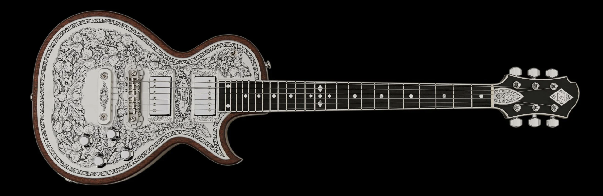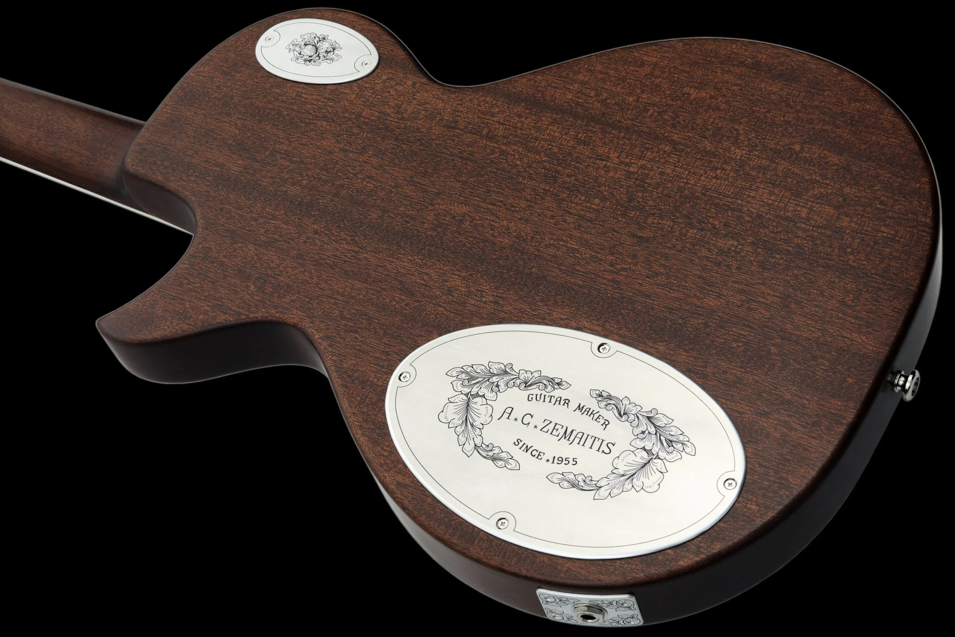 Il top in alluminio decorato da intarsi floreali, ma anche la placca che nasconde l’accesso al trussrod e la targhetta del marchio sulla paletta, distinguono a colpo d’occhio la MGF-AC-22 Metal Front; stesso discorso per il retro del body, provvisto di due placche, di nuovo in alluminio, che chiudono gli alloggi dell’elettronica di bordo. Il tutto, nel rispetto di quel rock-design che distingue la produzione Zeimatis sin dal 1955.