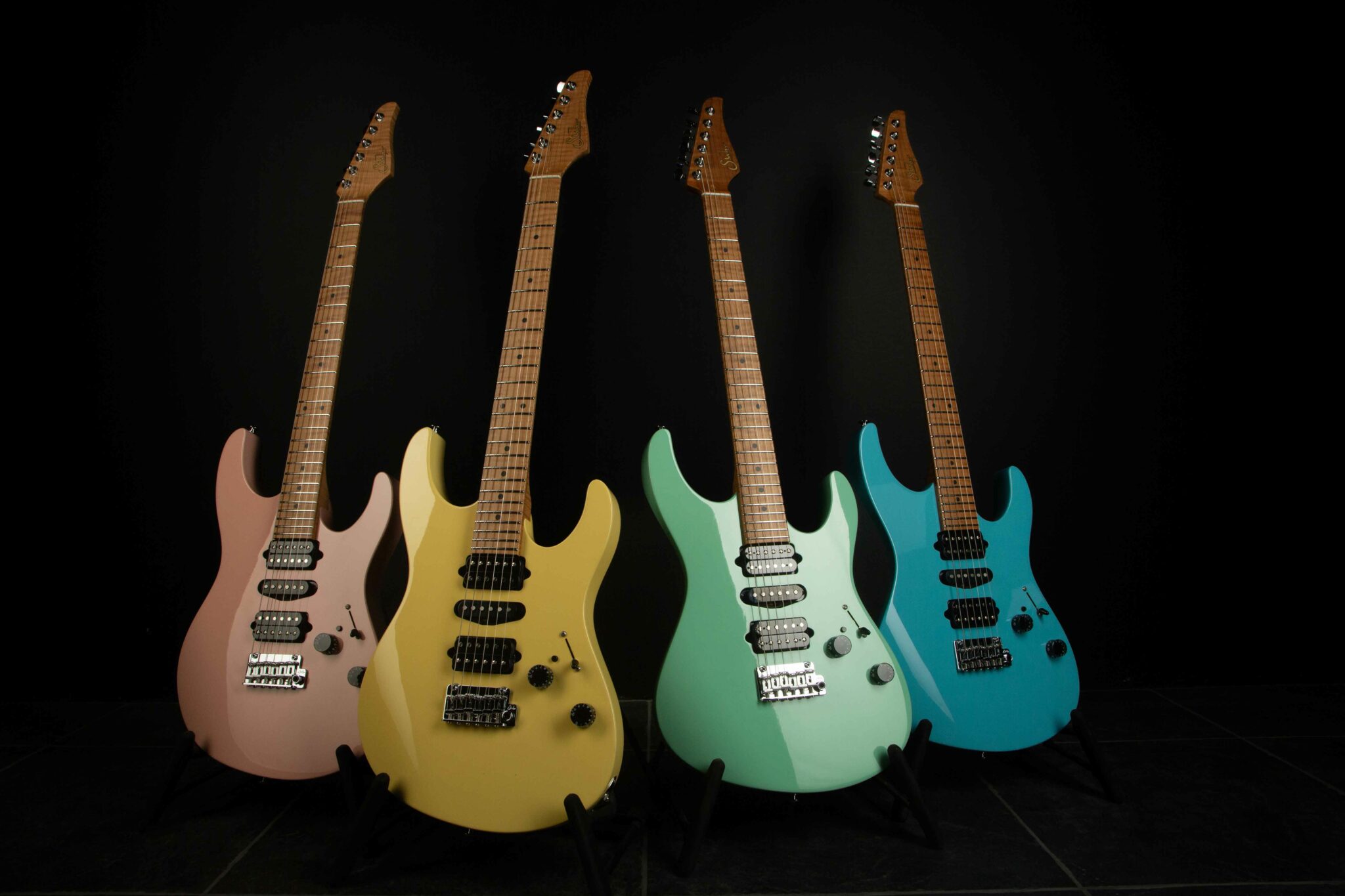 Surf Green, Vintage Yellow, Shell Pink e Daphne Blue: con queste quattro finiture con la classica verniciatura alla nitro, la nuova Modern Antique opta per un body in tiglio con il top in acero (2 pcs) concepito per una pasta sonora che privilegia brillantezza, attacco e sustain. Il manico e la tastiera sono in acero fiammato, sottoposto al processo di torrefazione perché il legno sia privato dell’umidità e garantisca il massimo grado di stabilità. Il manico si appropria inoltre del peculiare profilo che Suhr chiama Modern Elliptical (780”-830”), mentre la tastiera sfodera un radius di tipo compound (10”-14”) e 24 tasti Jumbo in acciaio. In quanto all’hardware, naturalmente firmato Suhr, la chitarra chiama a bordo sei meccaniche autobloccanti ed un ponte tremolo con 2-punti di ancoraggio e sellette in acciaio.