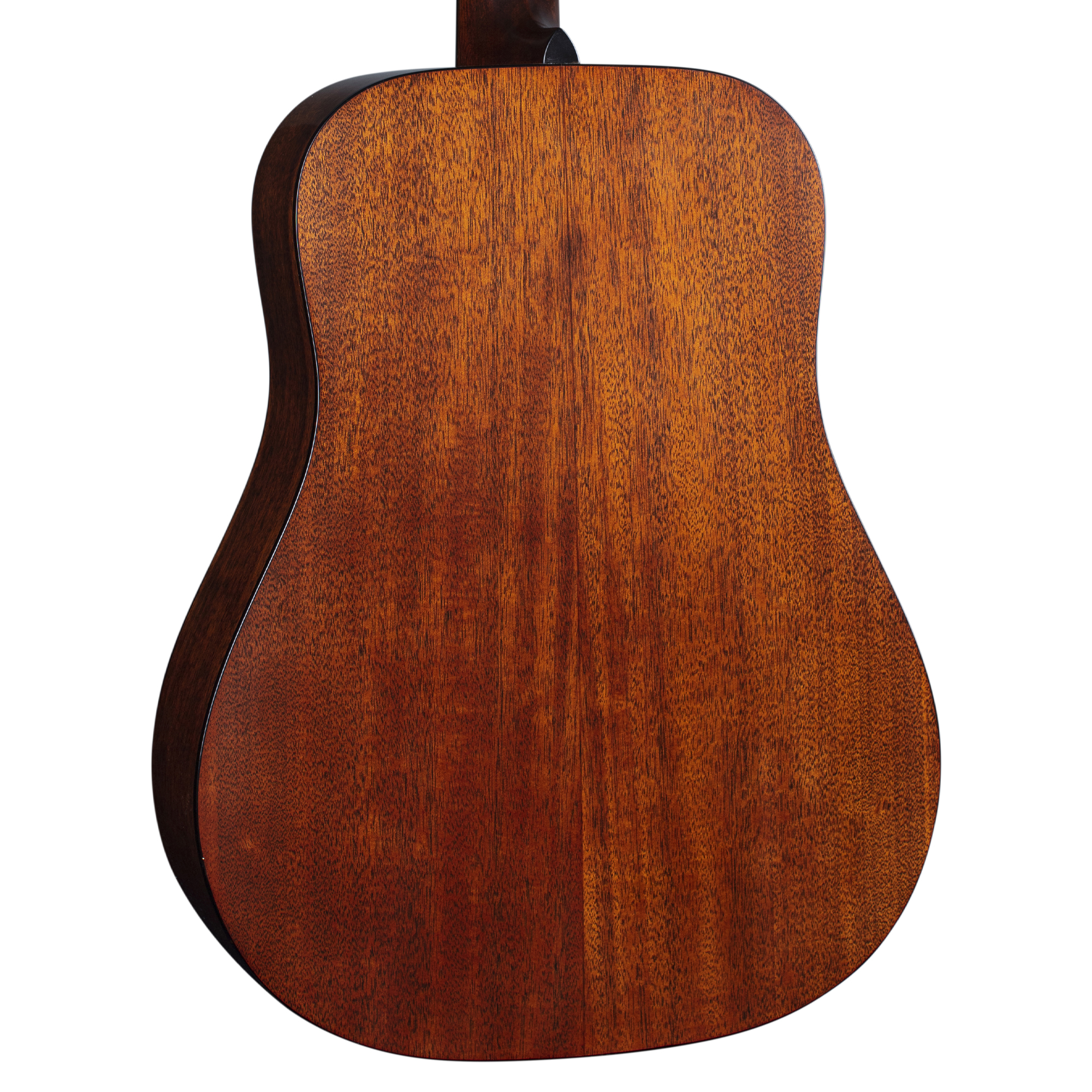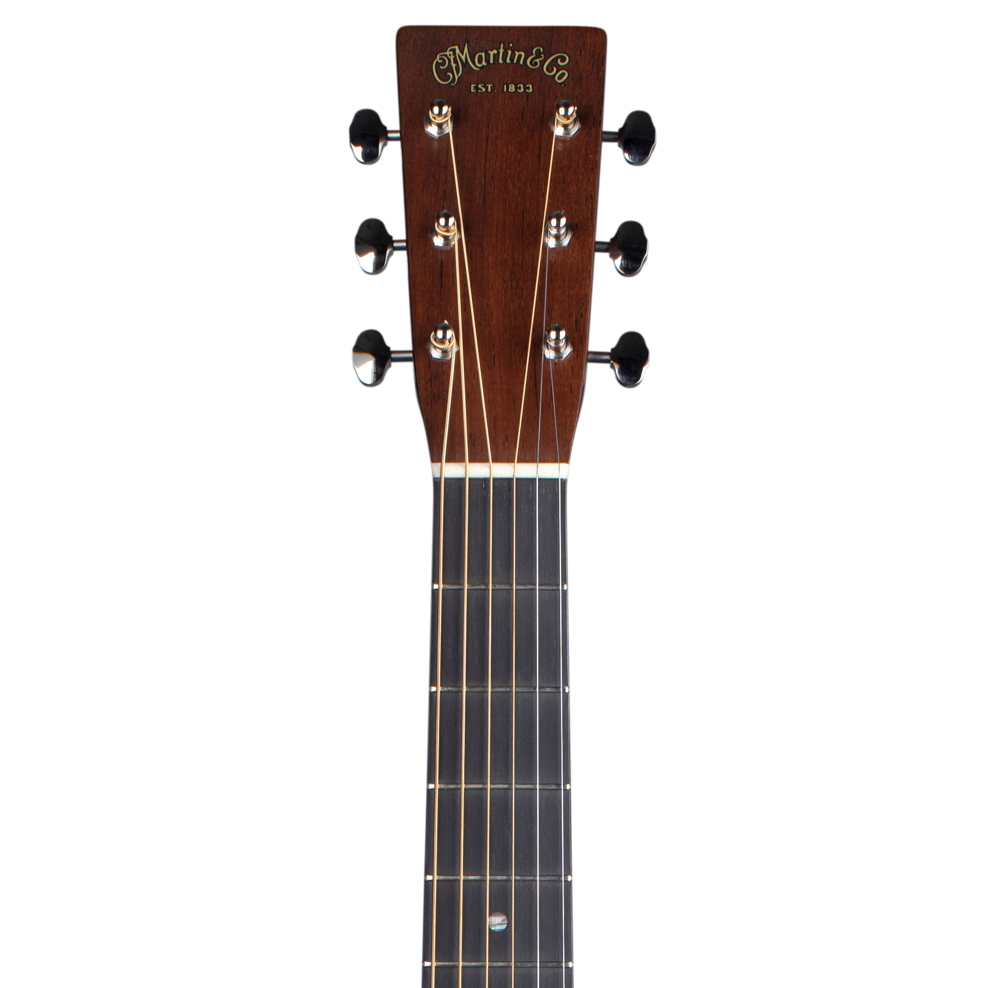Mogano per fondo e fasce e Adirondack per il top (VTS), manico incollato con giunzione a coda di rondine (Dovetail) al 14esimo tasto, e il peculiare sistema di catenature a X scalloped (di tipo Forward Shifted). Scala 25,4”. 20 tasti. Tastiera e ponte in ebano, capotasto in osso e battipenna tartarugato. Unica aggiunta odierna, un accurato profilo del body ispirato dalle dreadnought Martin che hanno dato il via alla storia.