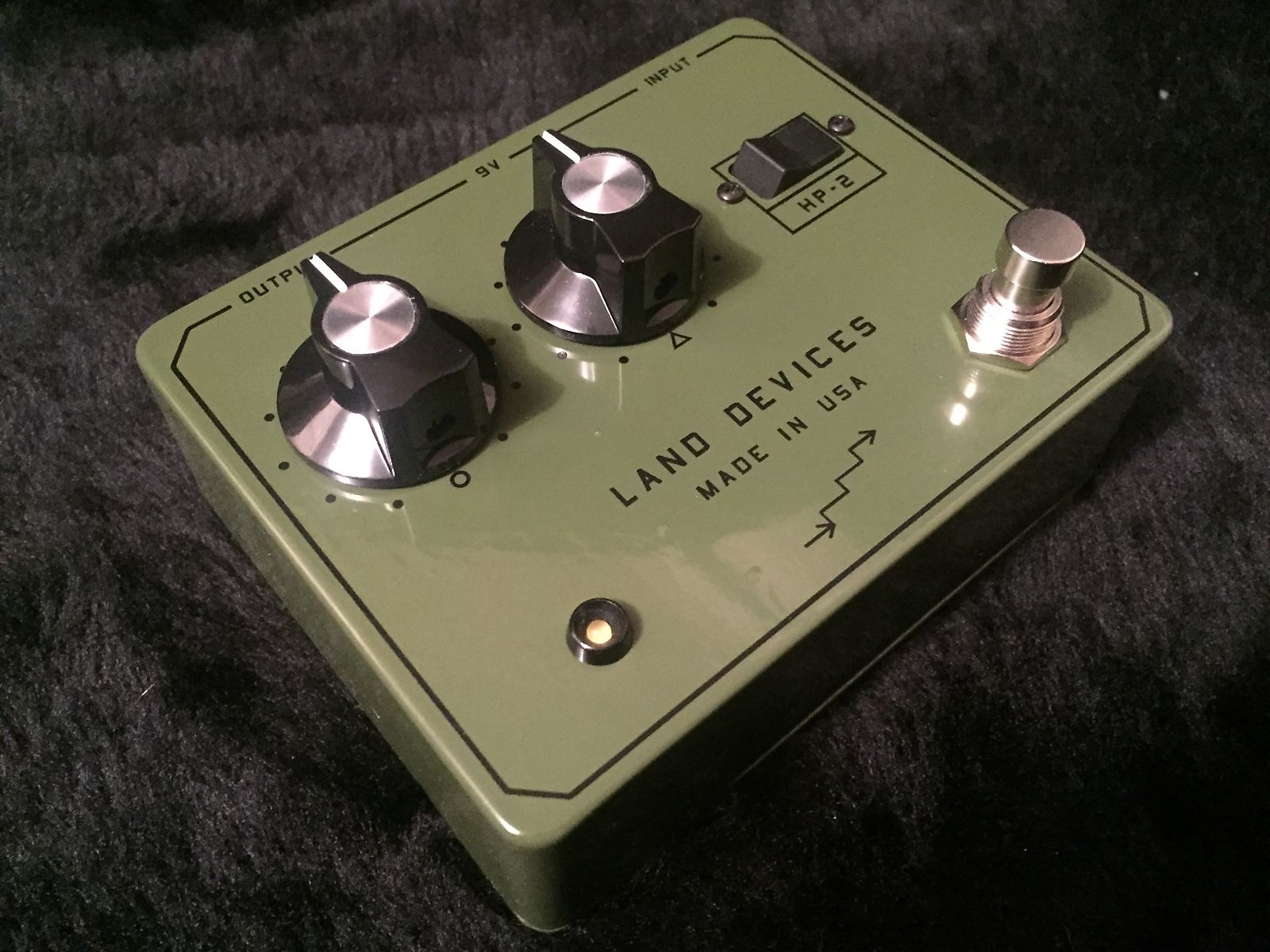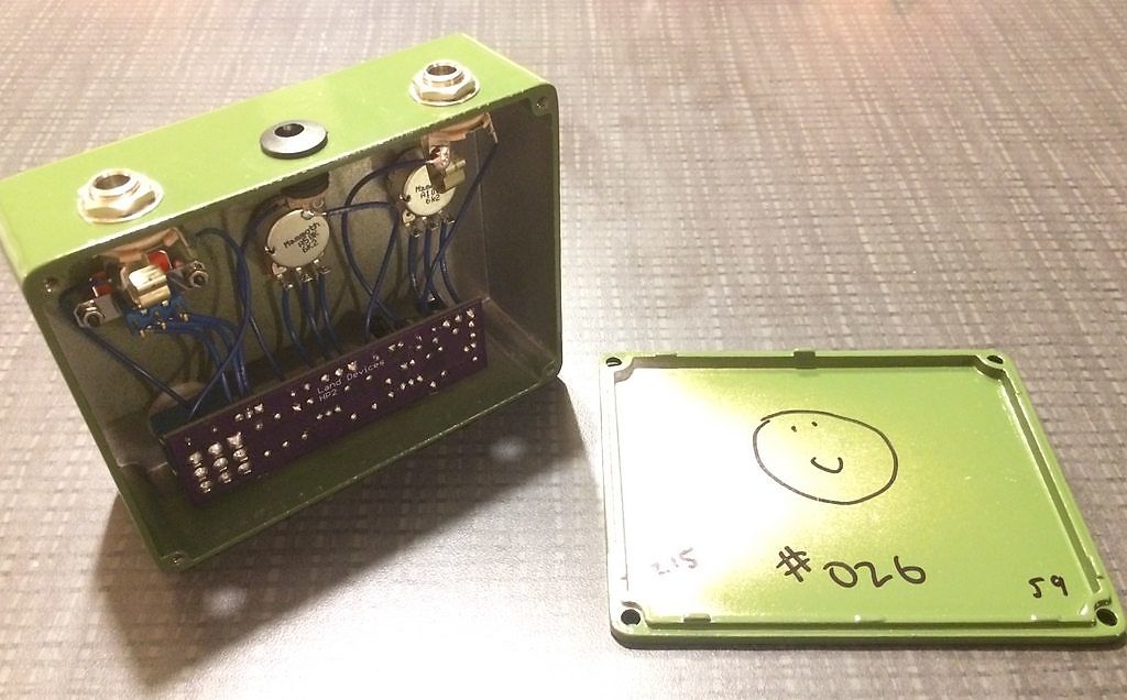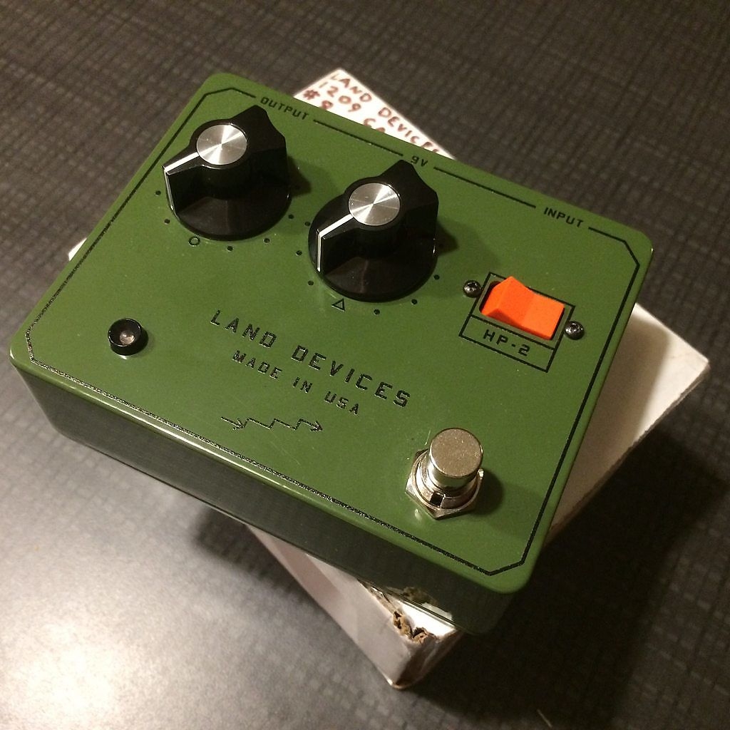 marchiato Land Devices è il sustain: molto lungo e piacevole per un suono ricco e articolato, che consente al chitarrista di spaziare dal dolce al brutale tramite due soli controlli rotativi: Gain (indicato da un piccolo cerchio) e Master Volume (indicato da un triangolo). A ciò si aggiunge un interruttore che consente l’inserimento della circuitazione originale priva dei diodi, dunque compressa e dolce, oppure l’inserimento di quella esaltata, con il transistor al germanio clippato, dunque meno compressa, in grado di sparare fuori tutto lo scibile delle armoniche possibile, con un sustain continuo. Non solo: la particolarità di questa circuitazione vecchio stile, è che risponde al tocco ed avverte quando il tono della chitarra viene chiuso, nonché quando il volume varia. (Tutto ciò è opera del compressore interno regolato ad arte allo scopo).