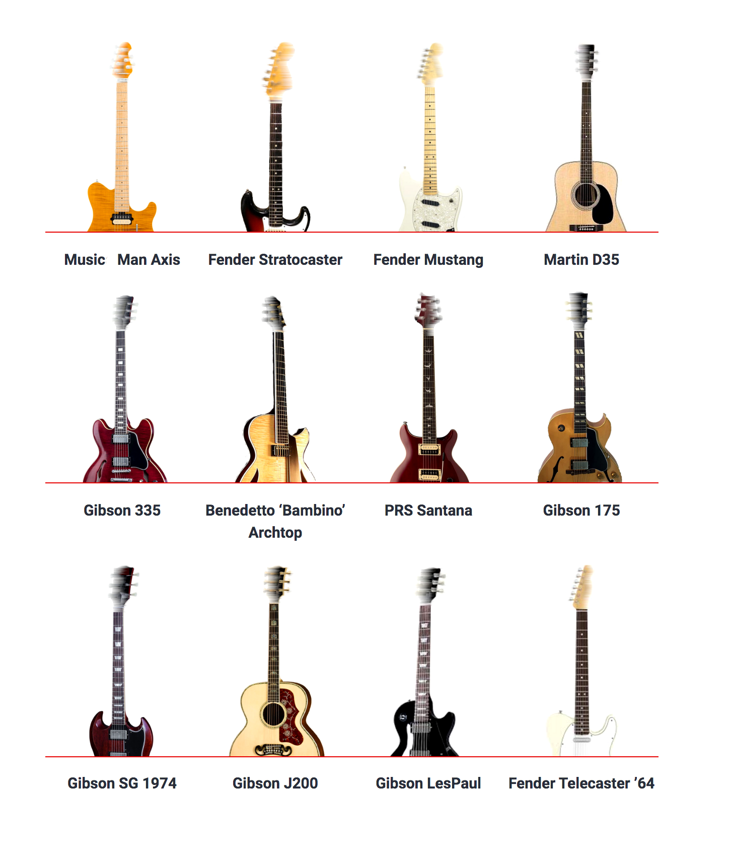 Chitarre target: MusicMan Axis, Fender Stratocaster, Fender Mustang, Martin D35, Gibson 335, Benedetto “Bambino” Archtop, PRS Santana, Gibson 175, Gibson SG 1974, Gibson J200, Gibson Les Paul, Fender Telecaster '64.
