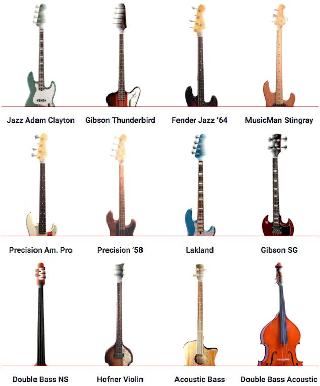 Bassi target: Jazz Adam Clayton, Gibson Thunderbird, Fender Jazz '64, MusicMan Stingray, Fender Prescision Am. Pro, Fender Precision '58, Lakland, Gibson SG, Double Bass NS, Hofner Violin, Acoustic Bass, Double Bass Acoustic.