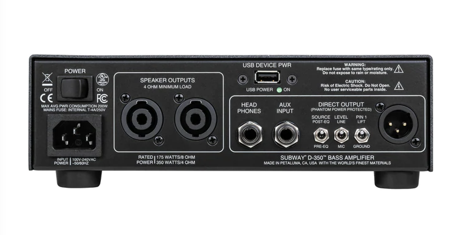 Le prese Aux In ed Headphones Out consentono l’utilizzo di cuffia e player per ascoltare e suonare il basso simultaneamente senza disturbare. Porta USB (500mA), Direct Output (con tanto di switch Mic/Line, Ground Lift e Pre/Post EQ) e Speaker Outputs per il collegamento a cabinet, completano il comparto delle connessioni collocate sul pannello posteriore.