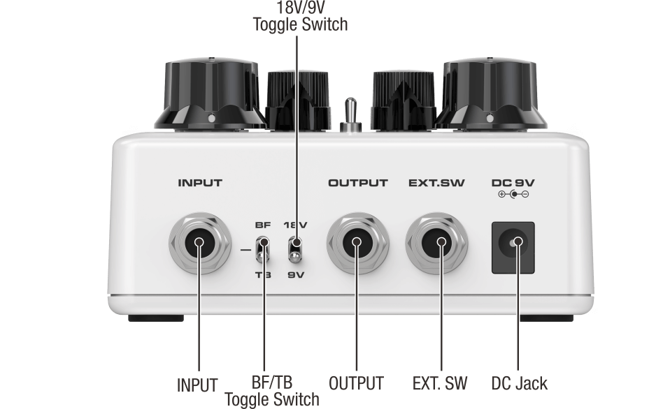 Sul pannello posteriore trovano posto ulteriori features: lo switch BF/TB, per la selezione delle modalità di funzionamento Buffer Bypass/True Bypass, più lo switch 18V/9V, per la selezione del voltaggio e il conseguente incremento della dinamica. A ciò si aggiungono le prese a jack In, Out e Ext Sw, oltre che la presa per l’alimentatore DC9V.