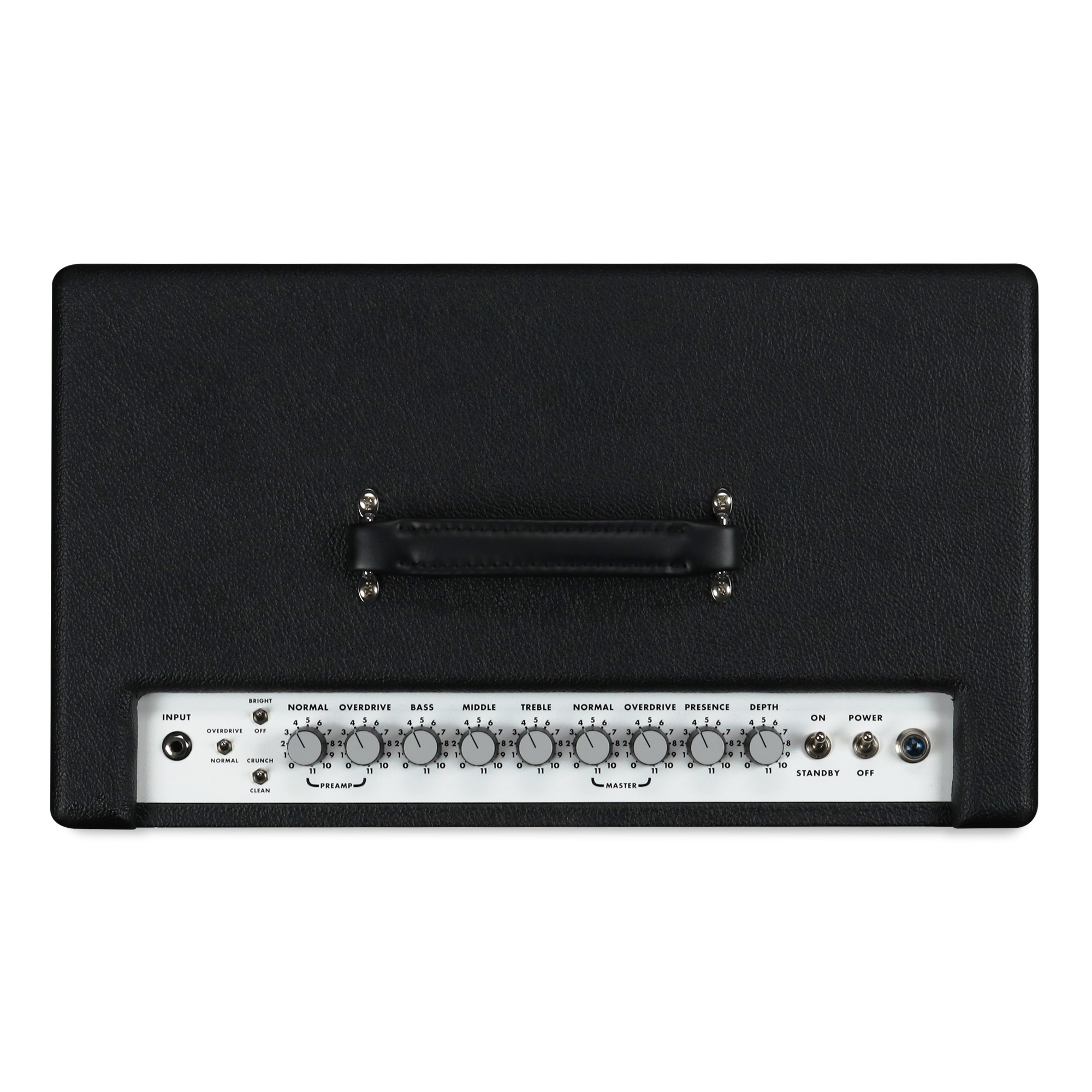 Partendo dalla sinistra del pannello, ecco che accanto alla presa a jack si collocano i tre mini-switch Overdrive/Normal, Bright/Off e Crunch/Clean, subito seguiti da una serie di potenziometri rotativi con denominazioni chiare ed esplicative: Normal/Overdrive (per la sezione Preamp), Bass, Middle, Treble (per la regolazione dell’Eq), Normal/Overdrive (per la sezione Master), quindi Presence e Depth.