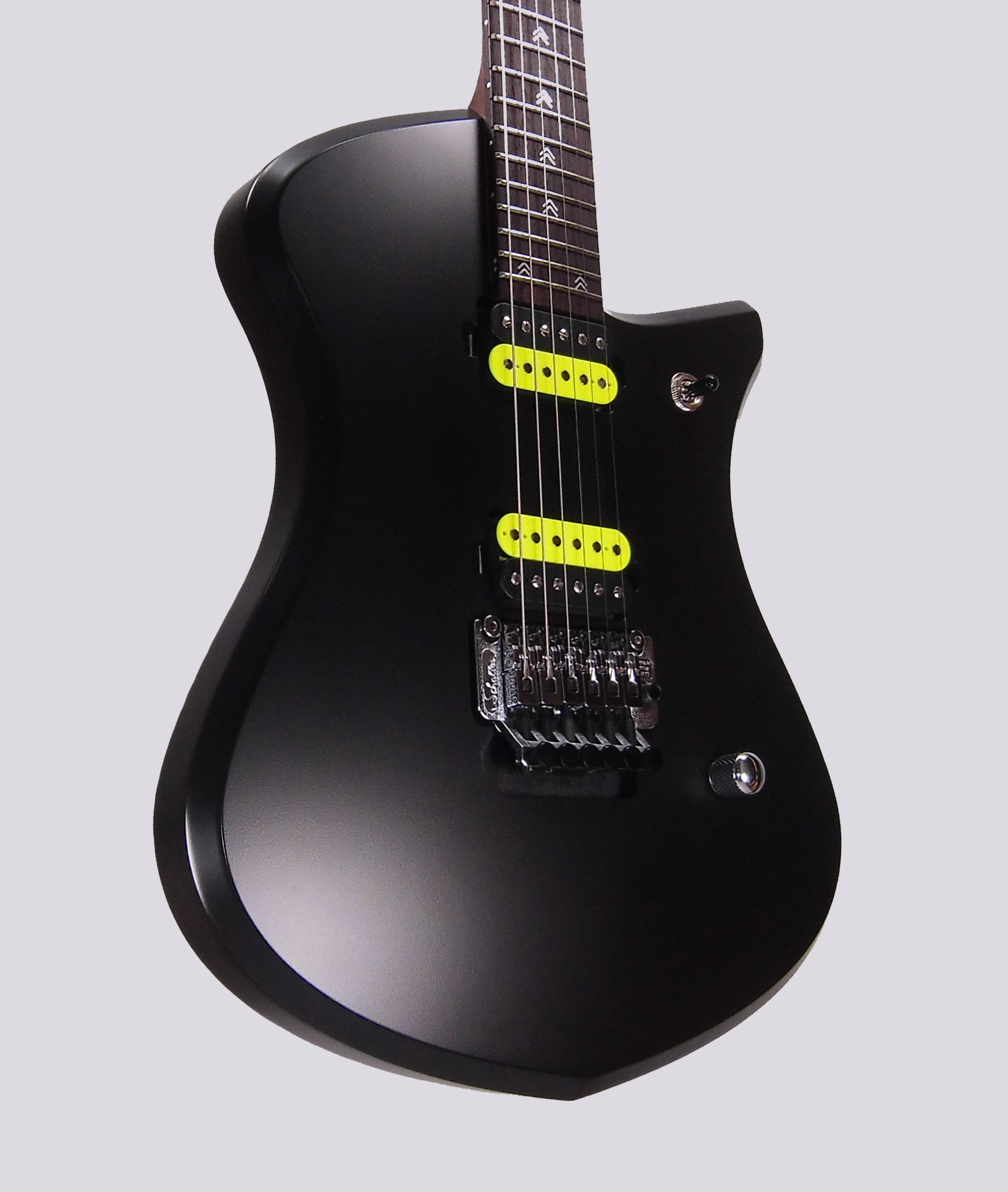 Proposta nella versione Black Panther, la Arianna Model qui illustrata è una solid body a spalla mancante che si fa notare sin dal primo sguardo. Finitura Matte Black (nero opaco), peculiare design di una paletta che ospita sei meccaniche Gotoh e ponte/tremolo Schaller Locking C.