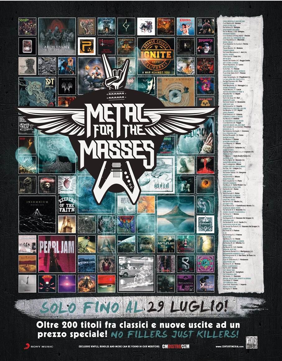 Da oggi e fino al 29 luglio 2017, saranno disponibili nei negozi tradizionali e negli store online oltre 200 titoli a prezzo speciale di numerosi artisti, tra cui Alice In Chains, System Of A Down, Korn, Lacuna Coil, Rage Against The Machine, Arch Enemy ed altri ancora… del catalogo Sony/Century Media Records.