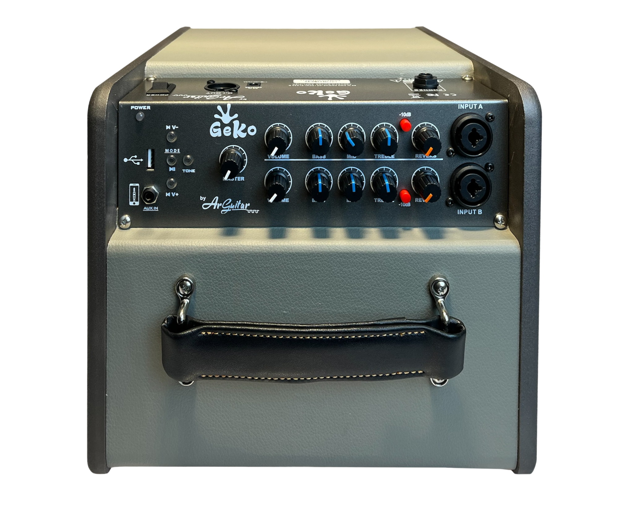 Sono due i canali di cui si avvantaggia Geko Amp, indipendenti, dunque ciascuno dotato di Eq a tre bande (Bass, Mid, Treble), di attenuatore -10dB, e dei controlli Reverb e Volume, per consentire al chitarrista di scolpire il suono nel dettaglio. Agli ingressi possono essere collegati o strumenti, o microfoni. Un Master completa la dotazione dei potenziometri rotativi.
