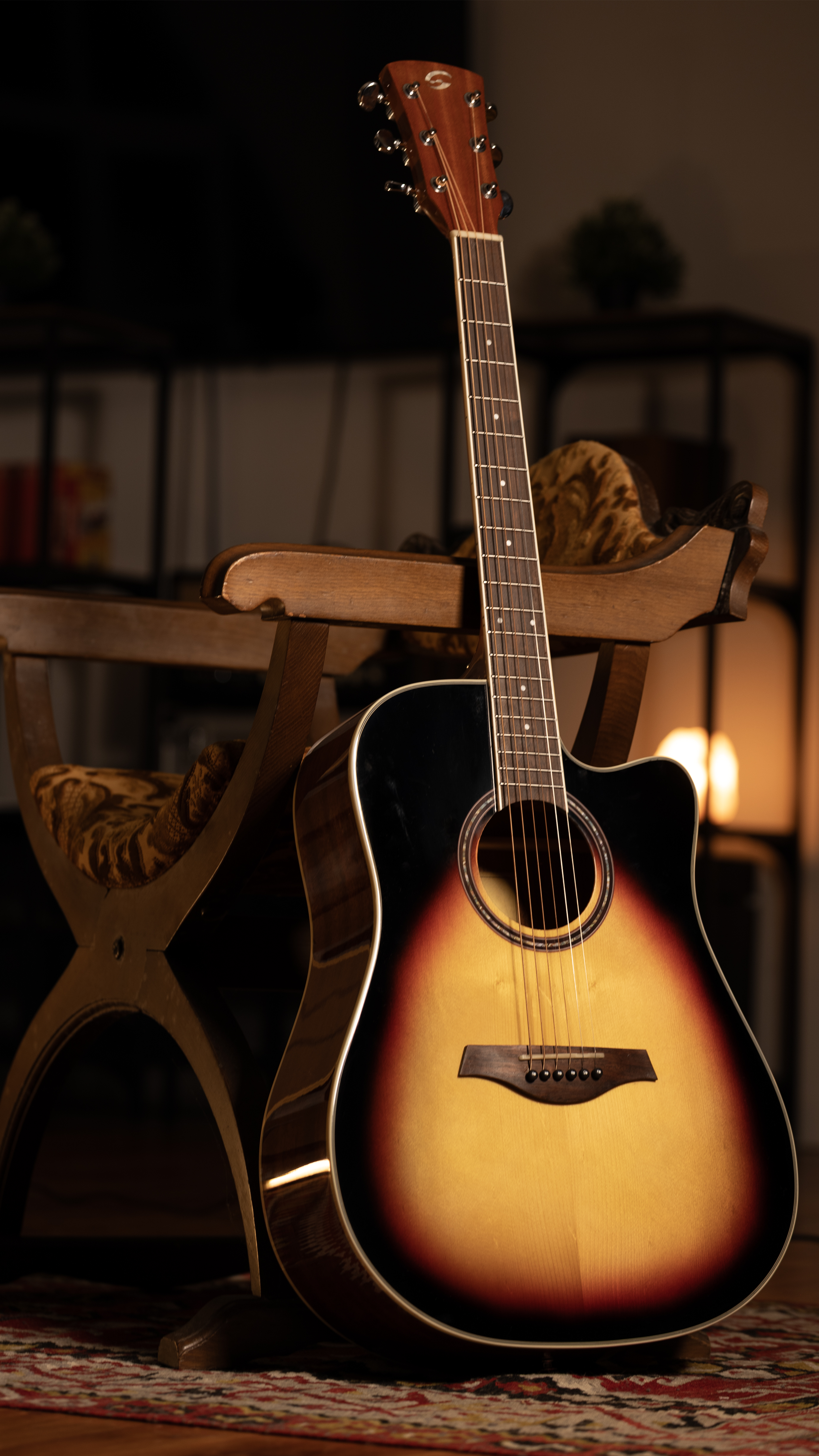 Body shape: Dreadnought, cutaway – Spessore body: mm 100-120 – Top: abete massello – Fondo/fasce: mogano – Manico: okoume, profilo a C – Radius: 16” – Tastiera/ponte: palissandro – Capotasto: osso, mm 43 – Meccaniche: Grover die-cast, cromate – Binding: Ivory ABS – Sistema preamplificazione: Fishman GT-1 – Corde: D’Addario EXP 16 – Finiture: Natural, Sunburst, Aged Cherry Sunburst – Prezzo: Euro 298,00