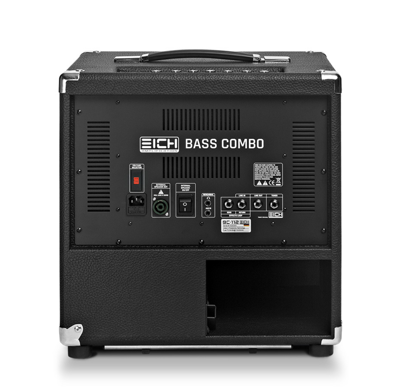 E’ decisamente ricco di features il pannello dei controlli, sul quale trovano posto potenziometri, switch e prese; Power per l’accensione/spegnimento dell’amplificatore e Master per la regolazione del volume, sono affiancati dagli switch Mute/Post e Ground Lift, nonché dalla presa DI per il collegamento a mixer, console di registrazione o amplificatori esterni. Eq a 4 bande (Lo, LoMid, HiMid e Hi), quindi Gain e Taste, quest’ultimo l’asso nella manica del combo Eich BC112. Ruotando il potenziometro in senso orario, il suono si arricchisce di punch e di una rotondità di tipo vintage; ruotandolo nel senso inverso, il suono si asciuga maggiorando l’attacco ed il growl dello spettro delle medie. Led per il Clip e ingresso a jack completano il pannello.