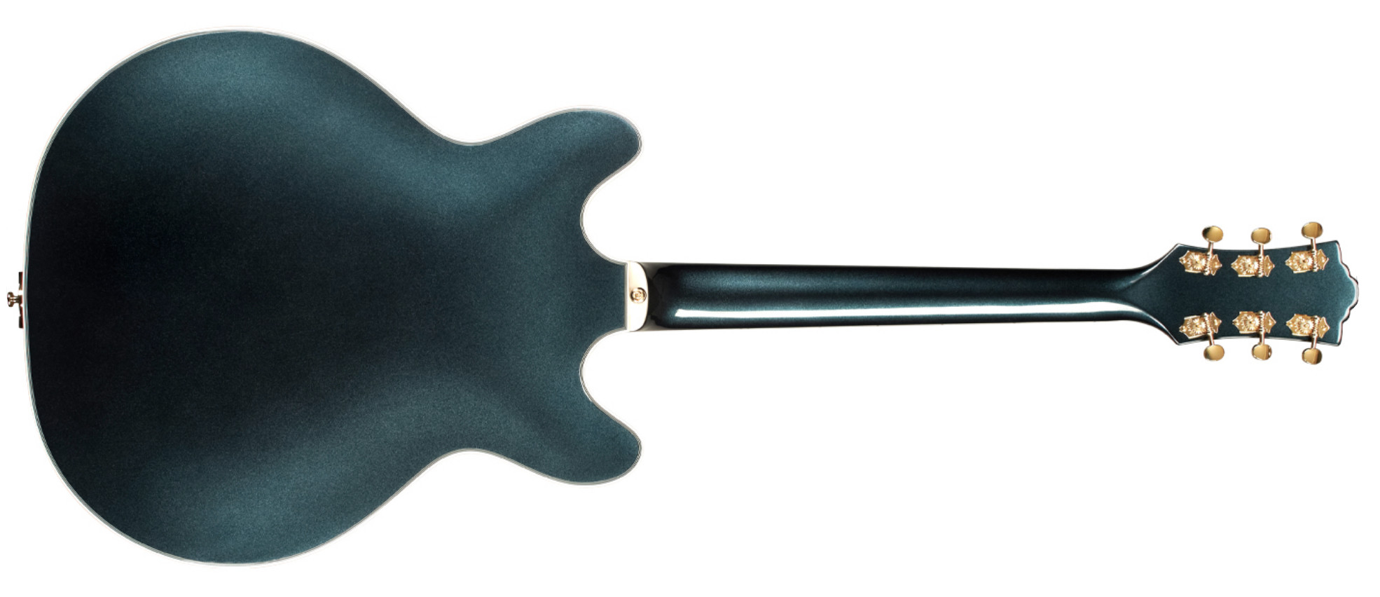 Il binding avorio su body, tastiera, buche a F e paletta, le coperture chiare delle mascherine dei pickup, i segnatasti in madreperla/abalone, il battipenna nero con logo Guild dorato, ma anche l’hardware dorato e la finitura metallica Kingswood Green di body e manico, consegnano alla nuova Guild Starfire VI Special una raffinatezza sonora ed estetica del tutto speciale… come indica il suo nome.