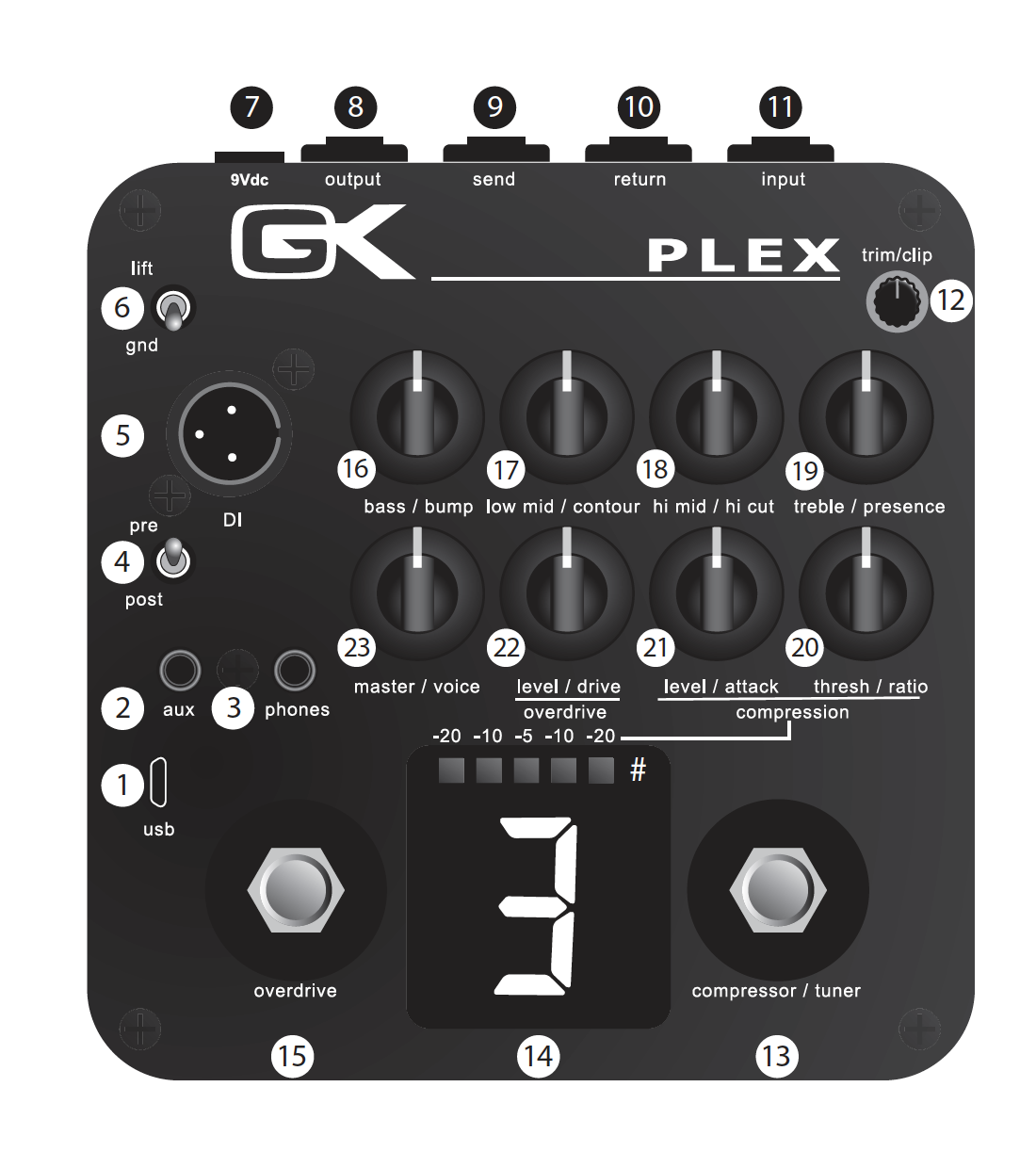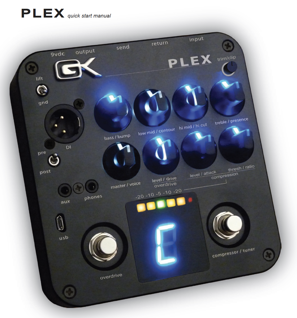 “No amp? No worries!” – esclama con orgoglio il brand californiano… Il formato friendly, compressore e distorsore, accordatore cromatico e display a led di generose dimensioni, fanno del G&K Plex l’estensione all-in-one di un setup. Ma non solo. Non tutte le performance consentono al musicista di utilizzare il proprio rig G&K ad alto volume: anzi, il vantaggio di collegarsi direttamente a un impianto e l’utilizzo degli in-ear monitor sul palco, gli consente di lasciare il proprio amplificatore a casa. Ebbene, il nuovo Plex e le sue virtualmente infinite regolazioni di tono e la vasta gamma di opzioni input/output analogiche/digitali, consente al musicista di avere il proprio suono G&K anche quando l’ampli non c’è.